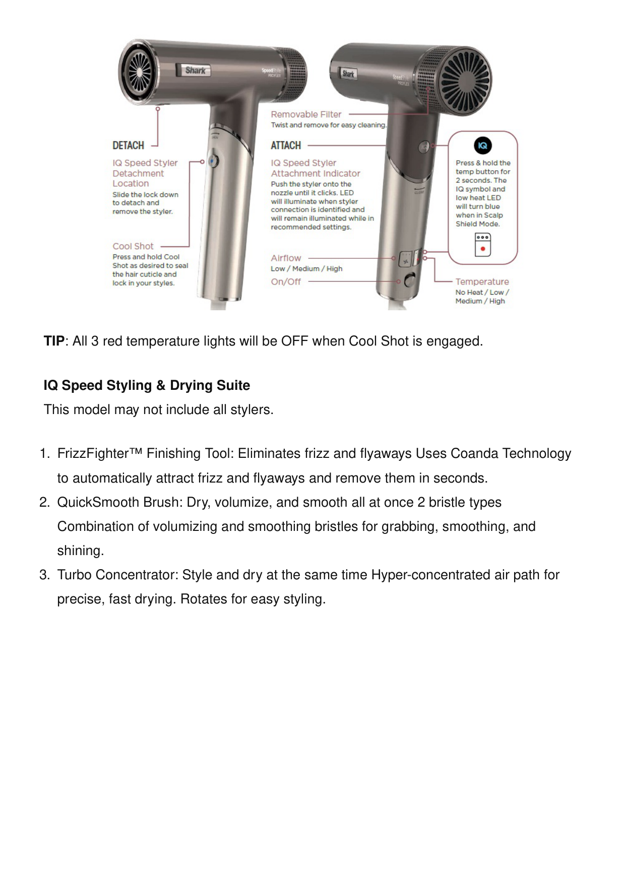 TIP: All 3 red temperature lights will be OFF when Cool Shot is engaged. IQ Speed Styling & Drying Suite This model may not include all stylers.