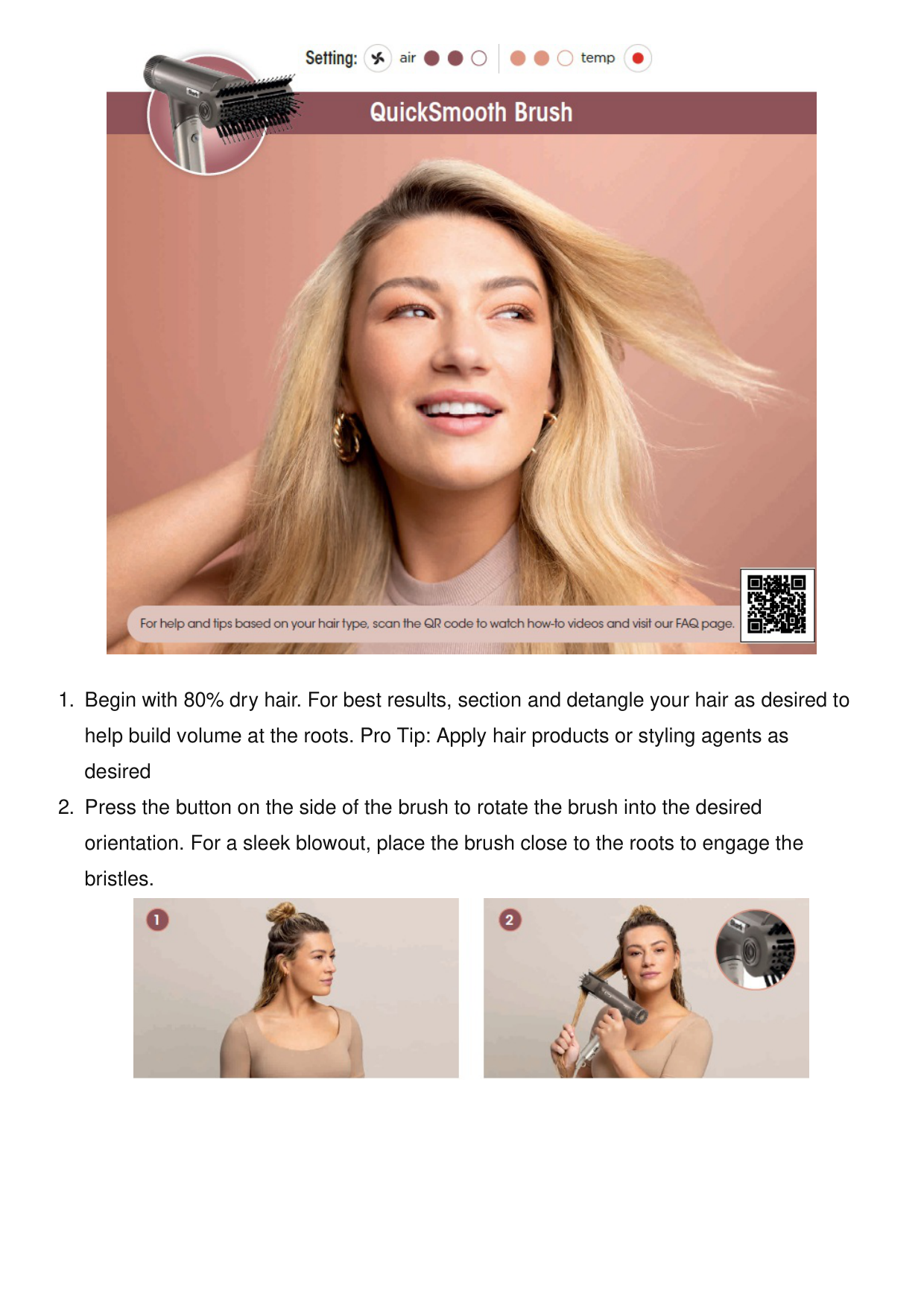 You should begin with 80% dry hair for best results with the QuickSmooth Brush. For best results, section and detangle your hair as desired to help build volume at the roots.
