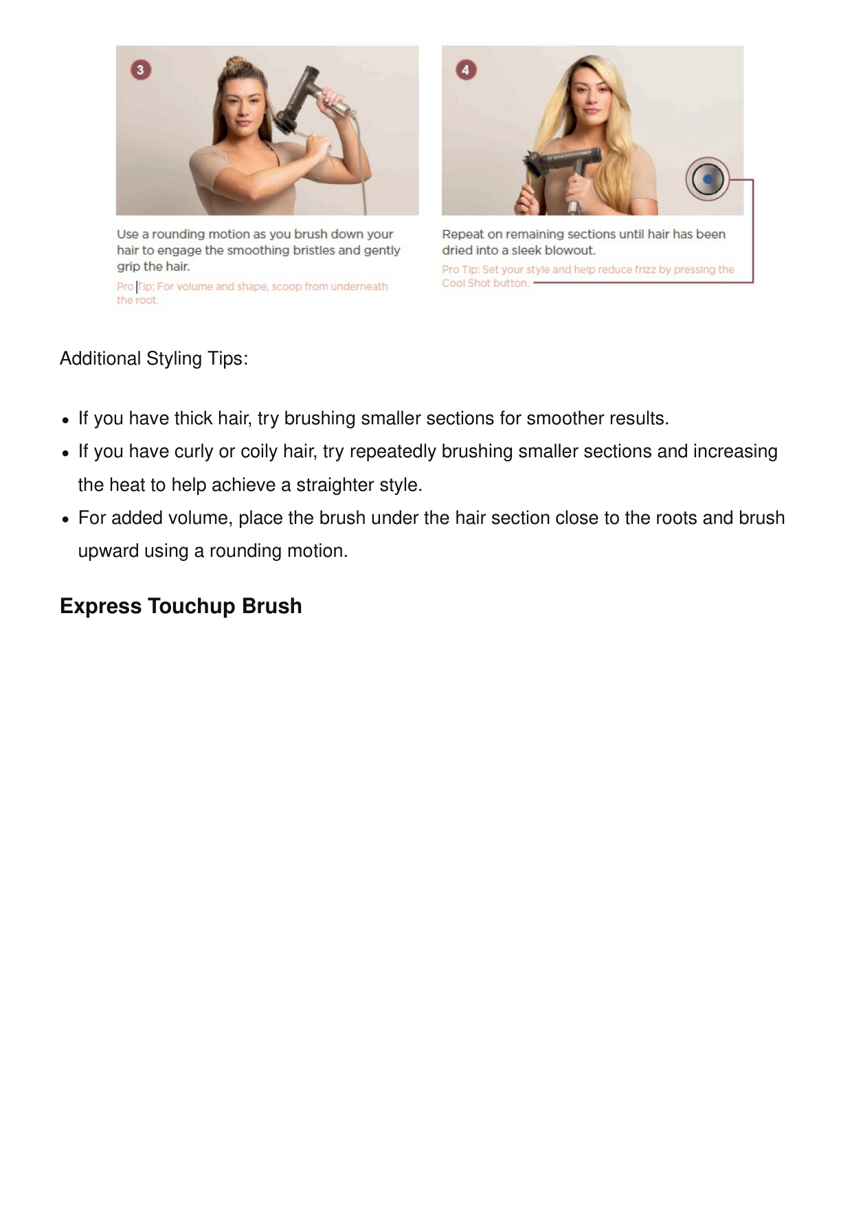 Additional Styling Tips: If you have thick hair, try brushing smaller sections for smoother results. If you have curly or coily hair, try repeatedly brushing smaller sections and increasing the heat to help achieve a straighter style. For added volume, place the brush under the hair section close to the roots and brush upward using a rounding motion. Express Touchup Brush
