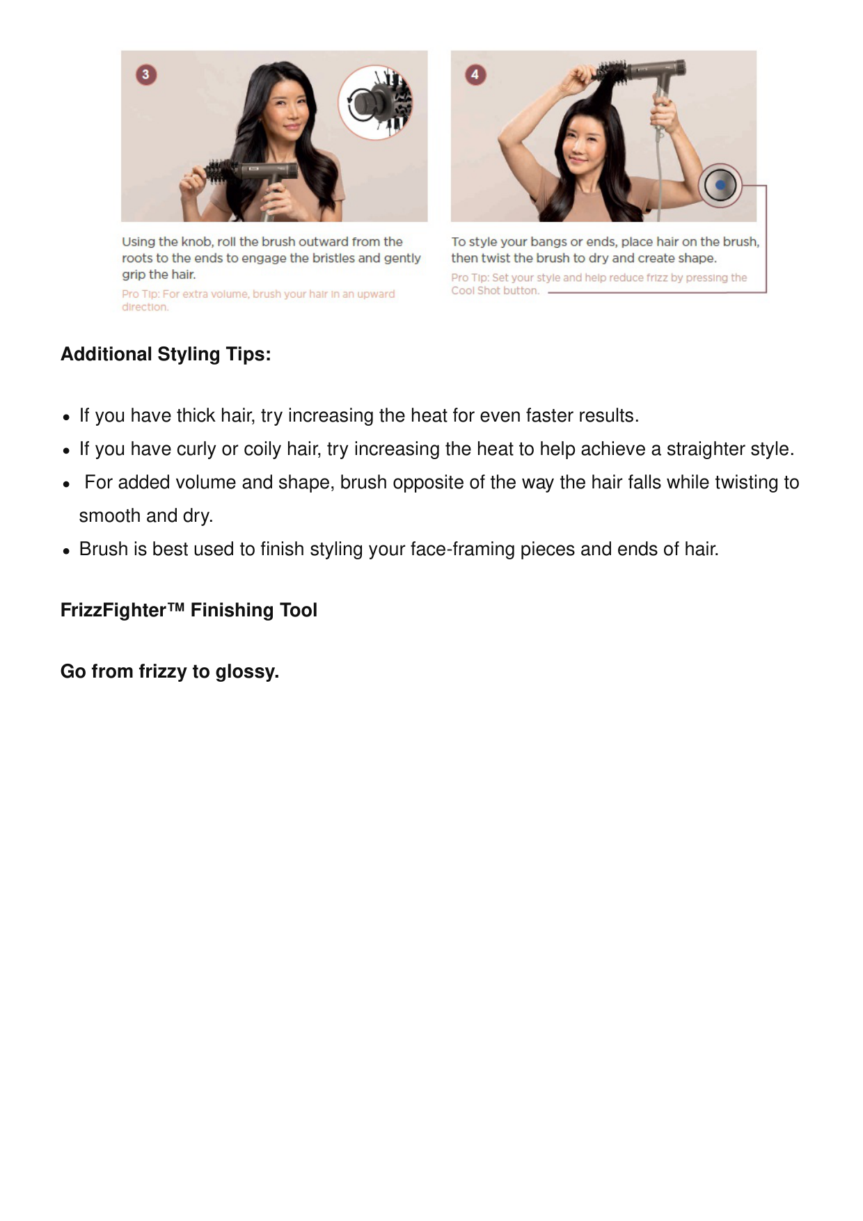 Additional Styling Tips: If you have thick hair, try increasing the heat for even faster results. If you have curly or coily hair, try increasing the heat to help achieve a straighter style. For added volume and shape, brush opposite of the way the hair falls while twisting to smooth and dry. Brush is best used to finish styling your face-framing pieces and ends of hair. FrizzFighter™ Finishing Tool Go from frizzy to glossy.