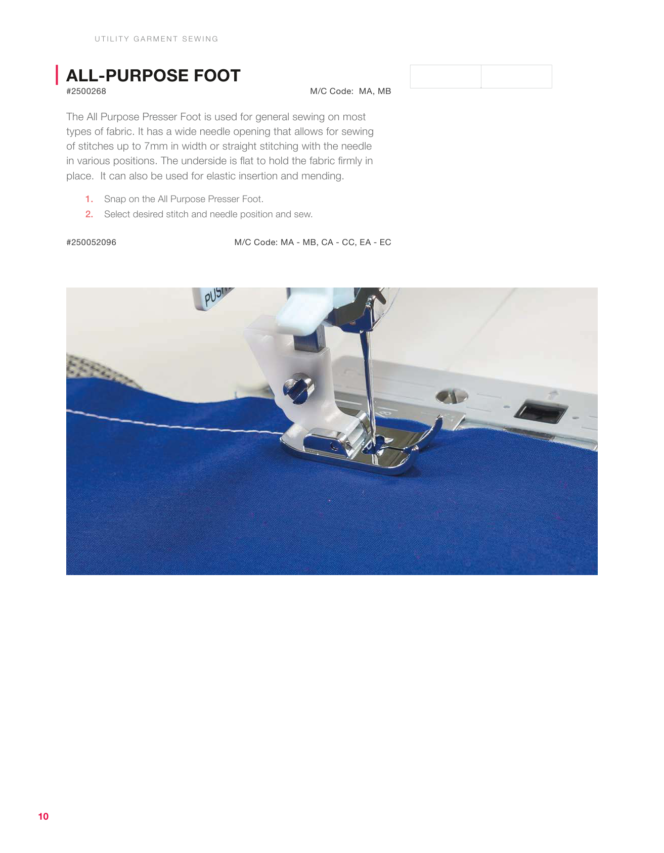 #2500268 M/C Code: MA, MB The All Purpose Presser Foot is used for general sewing on most types of fabric. It has a wide needle opening that allows for sewing of stitches up to 7mm in width or straight stitching with the needle in various positions. The underside is flat to hold the fabric firmly in place. It can also be used for elastic insertion and mending.U T I L I T Y G A R M E N T S E W I N G