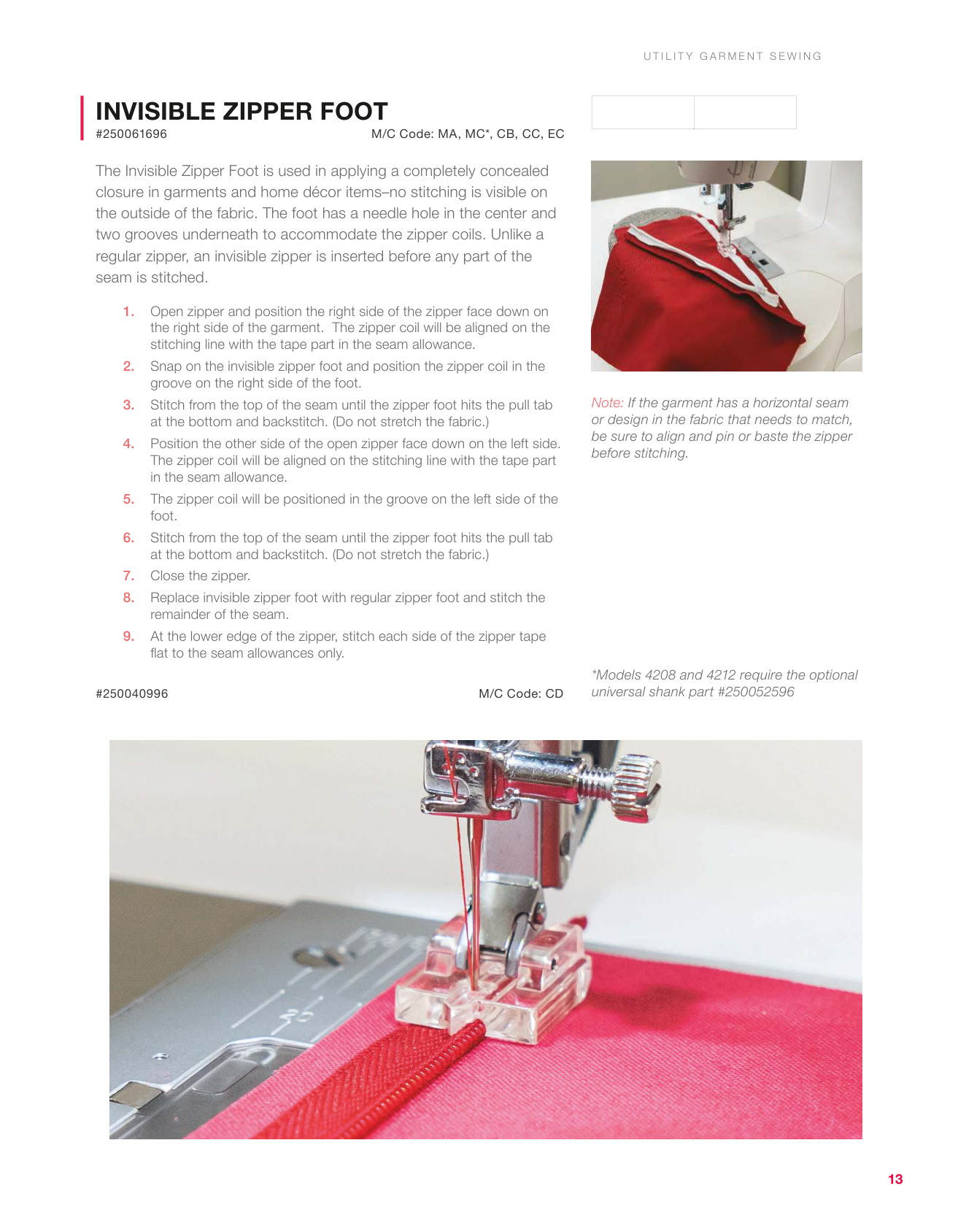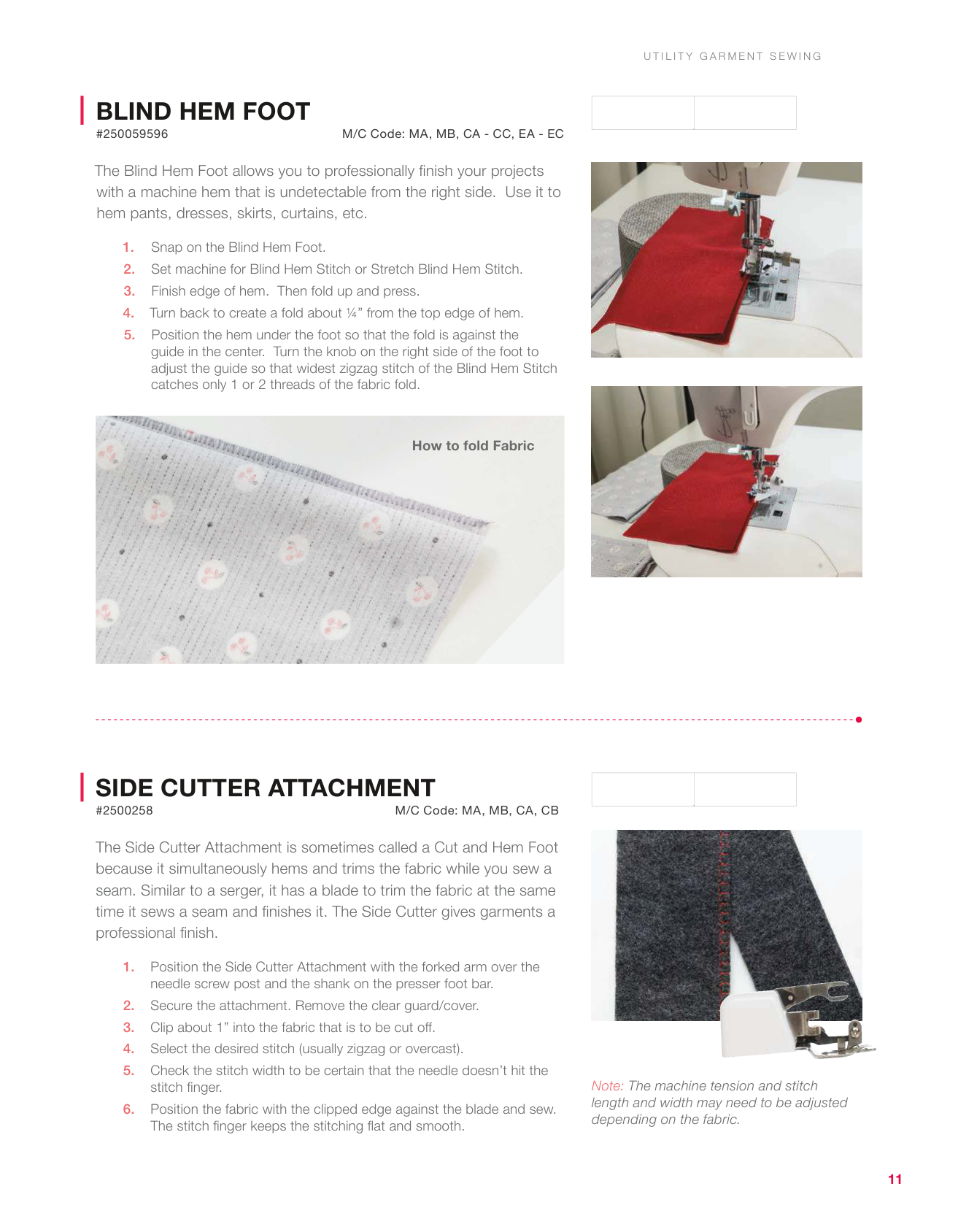 #250059596 M/C Code: MA, MB, CA - CC, EA - EC The Blind Hem Foot allows you to professionally finish your projects with a machine hem that is undetectable from the right side. Use it to hem pants, dresses, skirts, curtains, etc.Side Cutter Attachment