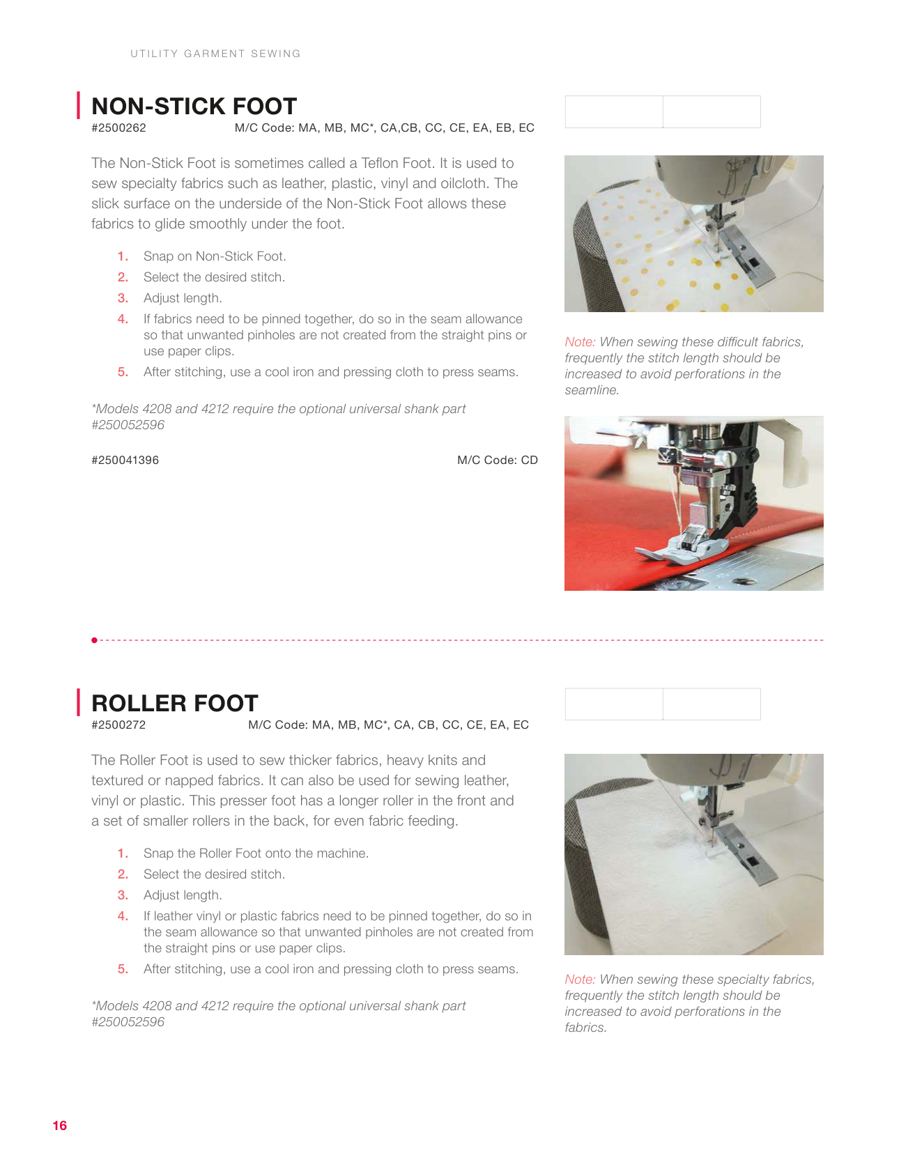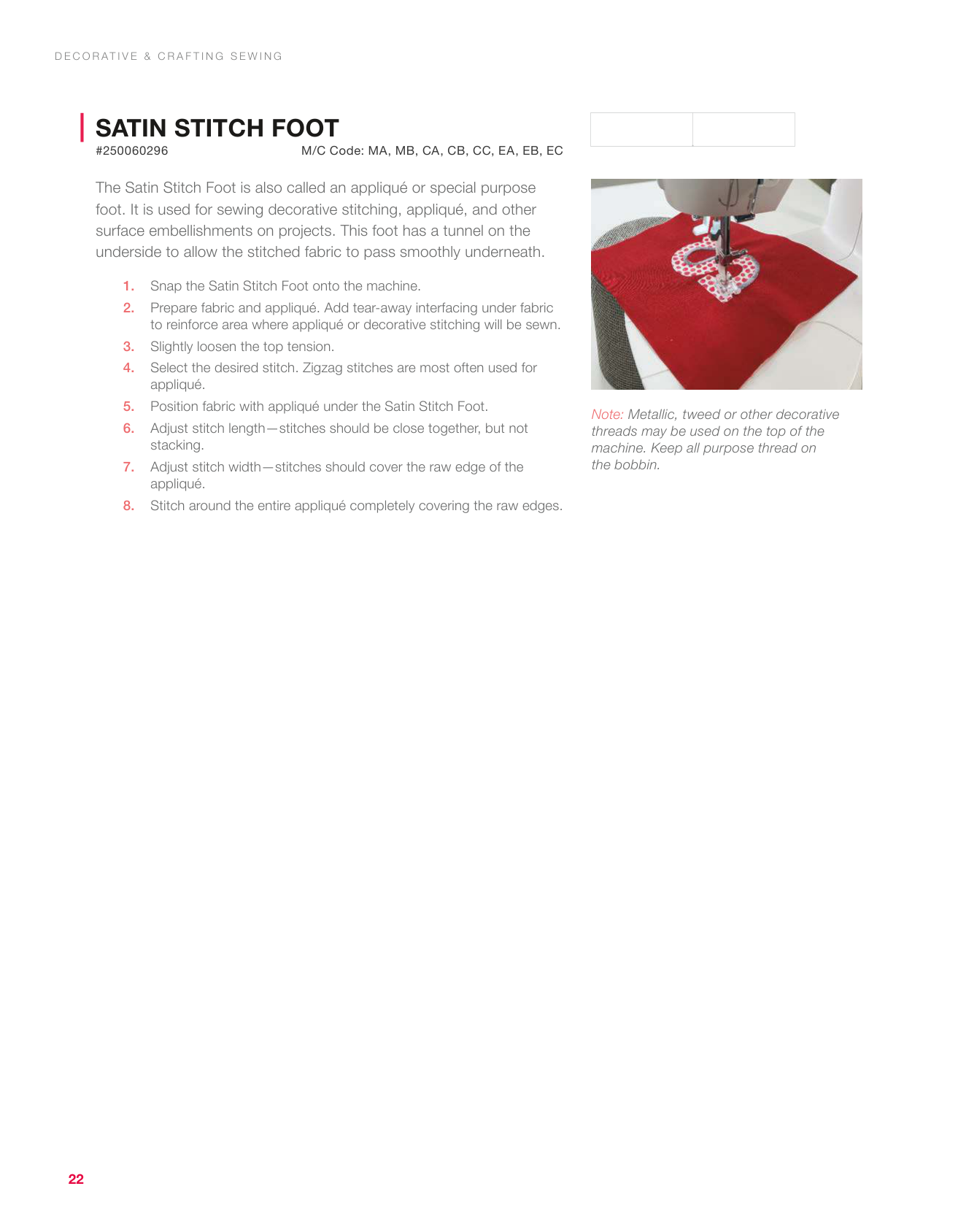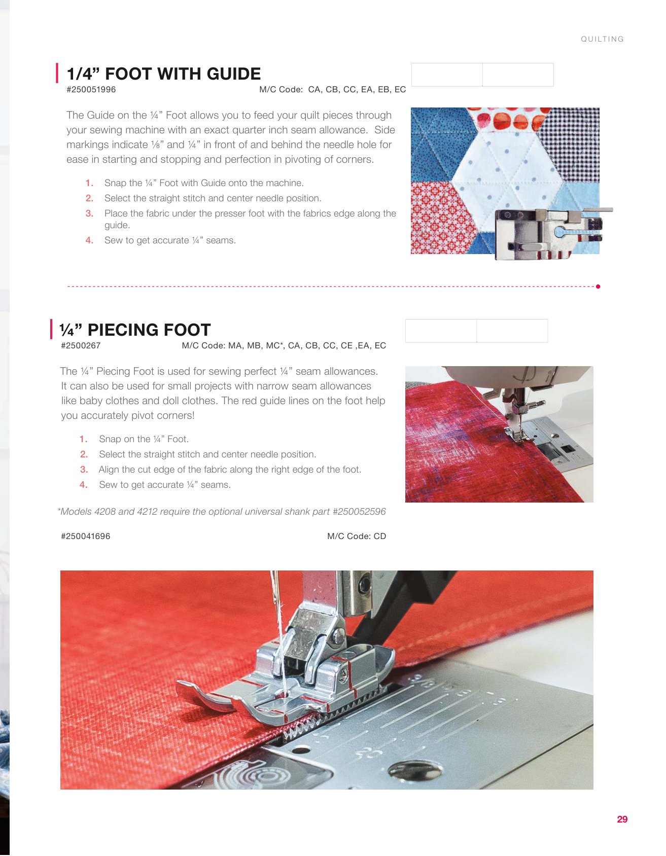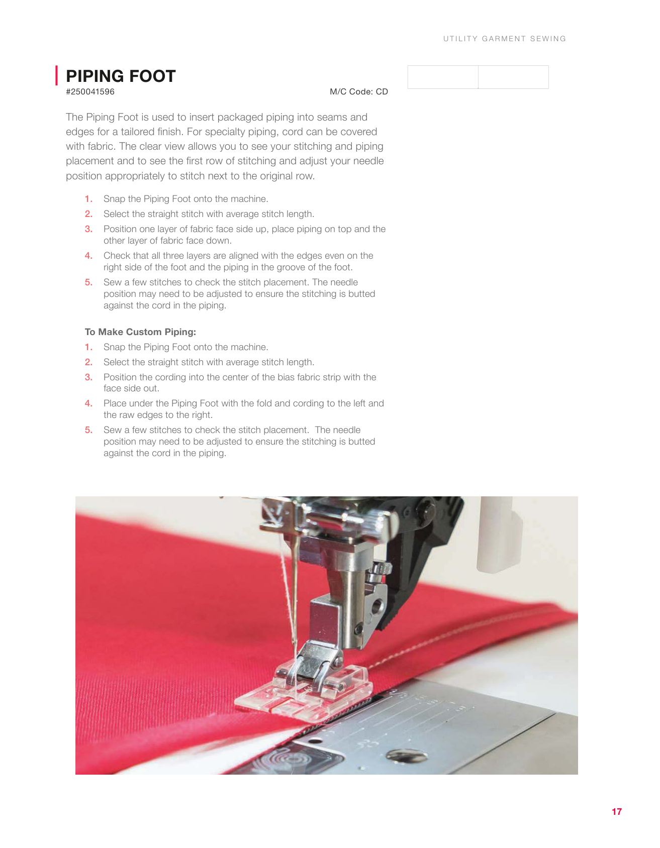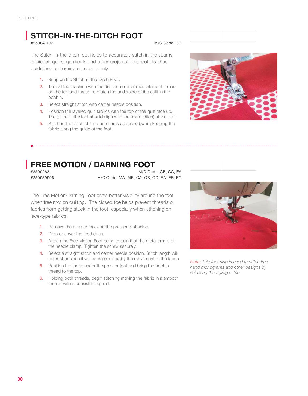#250052196M/C Code: MA - MB, CA - CC, EA - EC The small needle hole of this foot prevents the fine or light weight fabrics from getting caught on the feed dogs, causing puckering or skipped stitches.