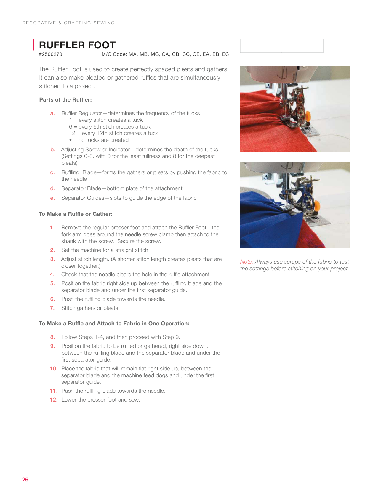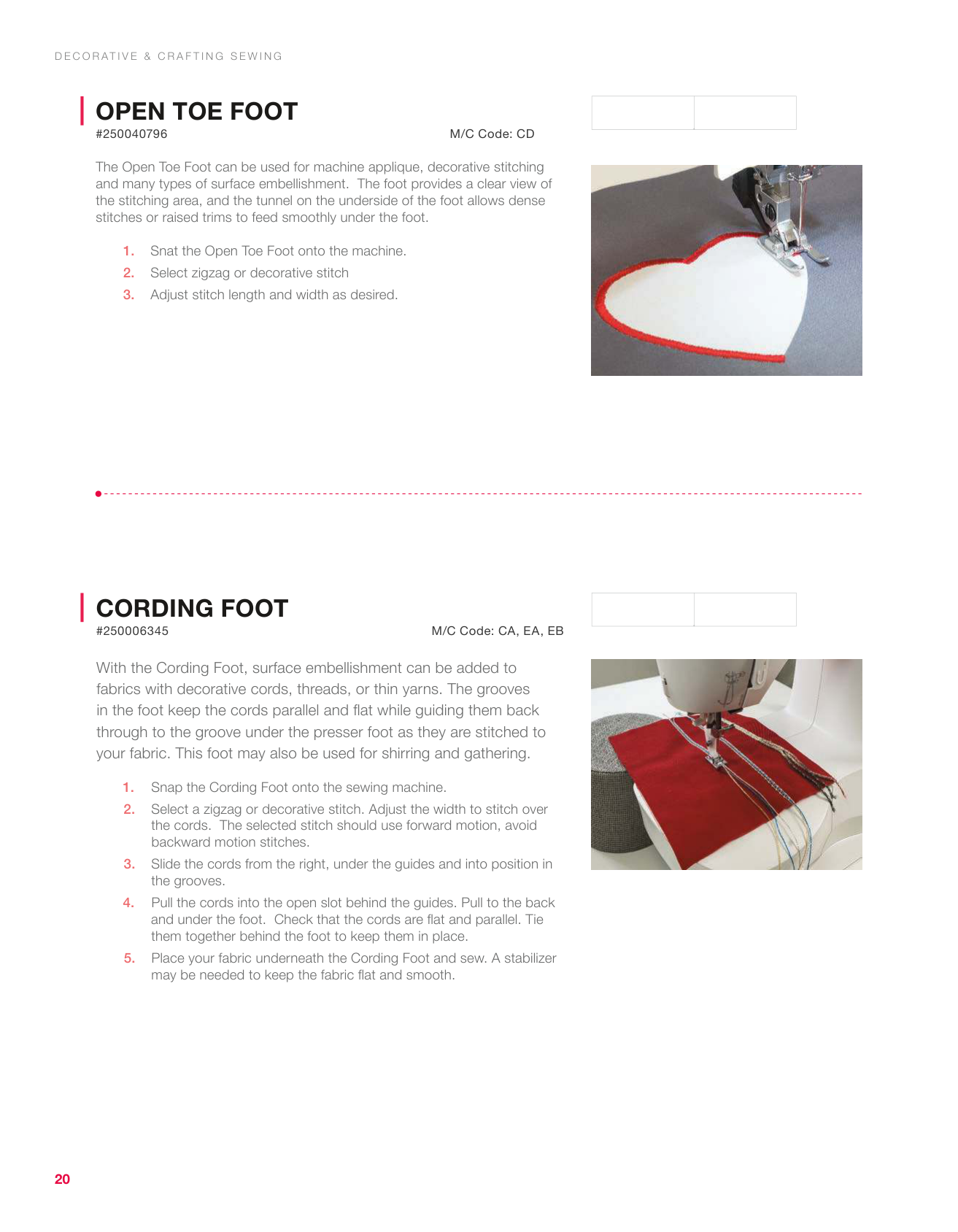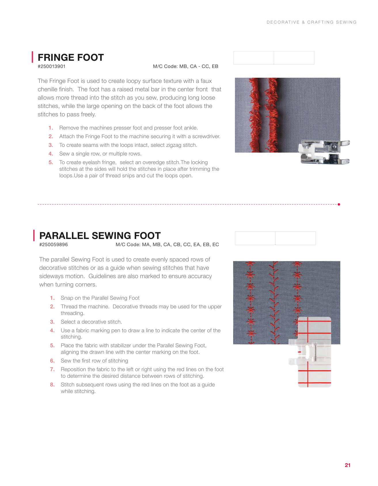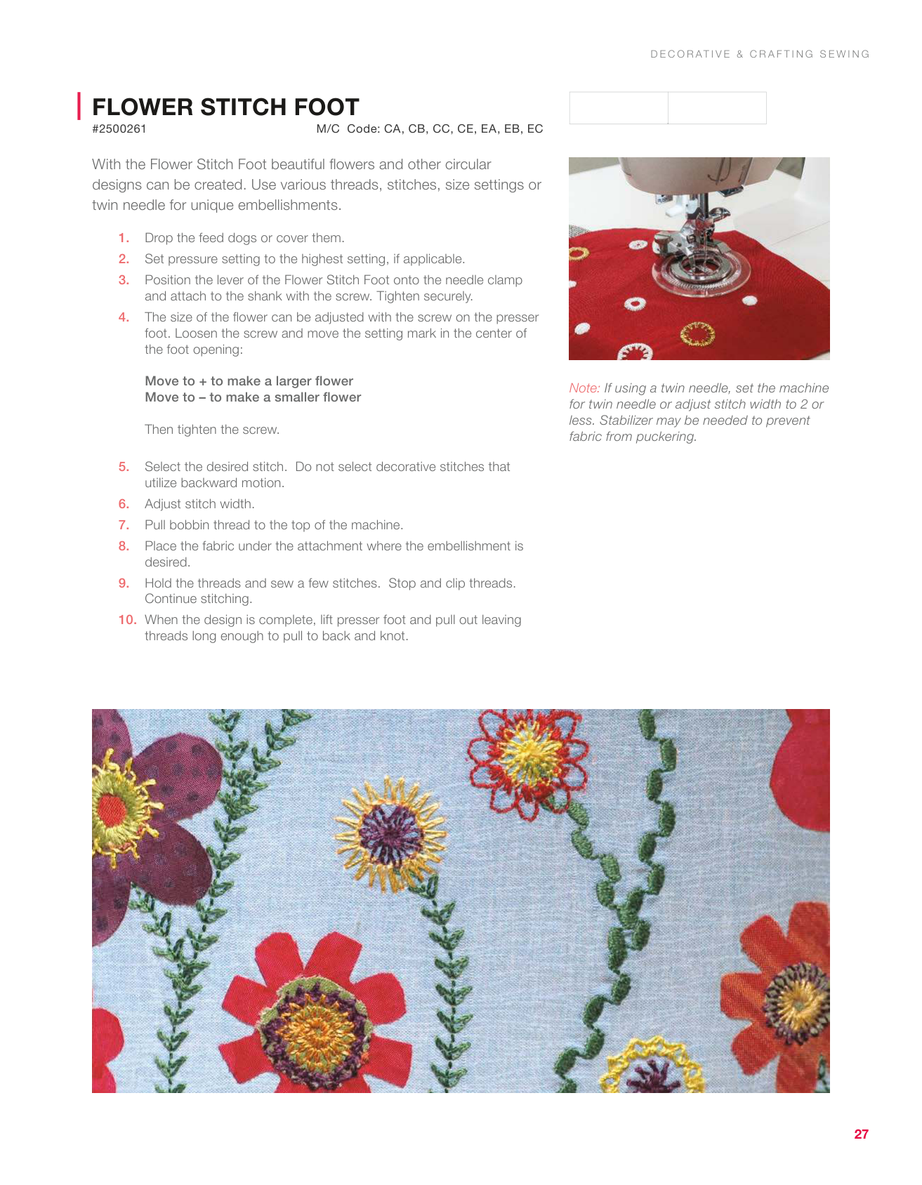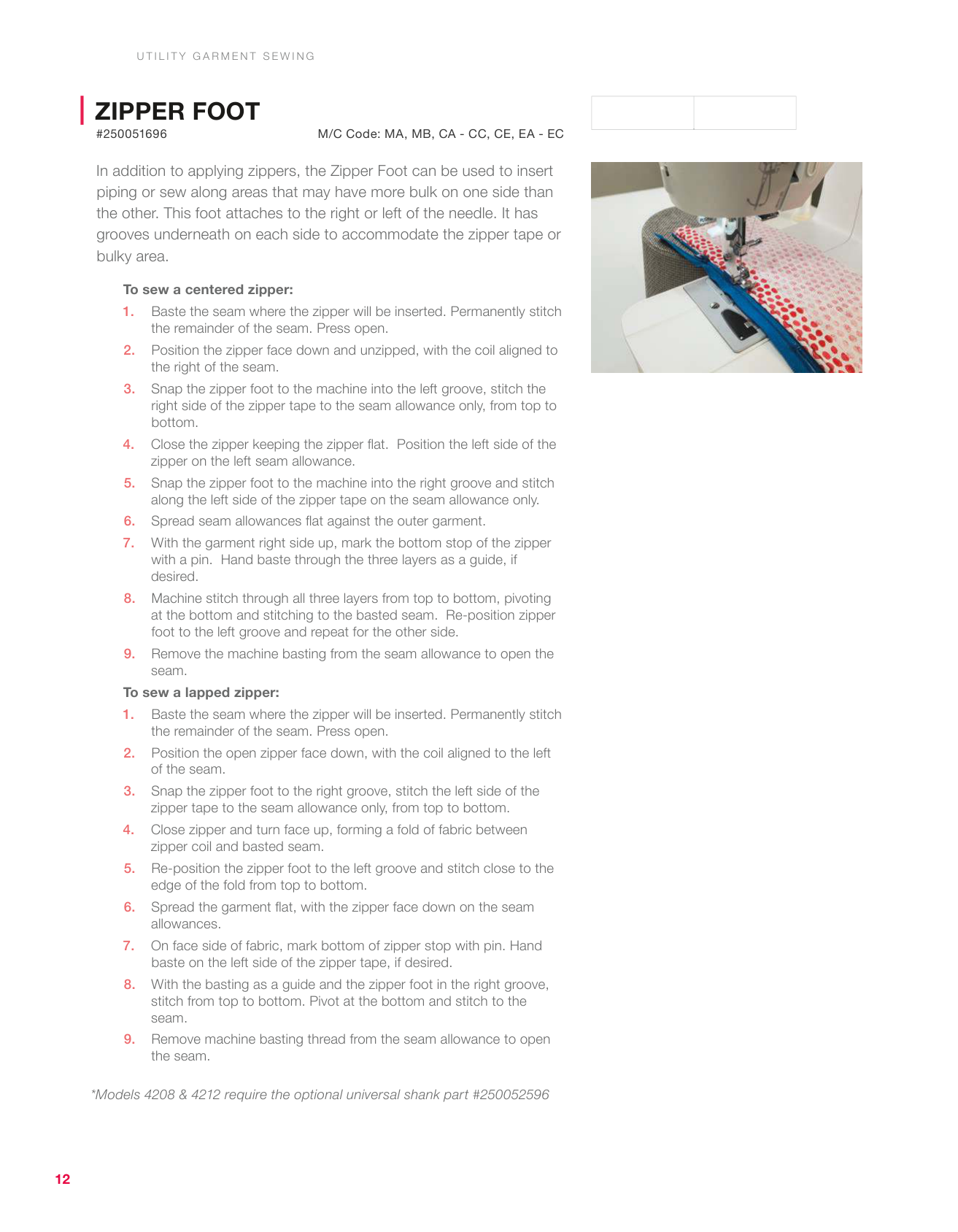 #250052196M/C Code: MA - MB, CA - CC, EA - EC The small needle hole of this foot prevents the fine or light weight fabrics from getting caught on the feed dogs, causing puckering or skipped stitches.