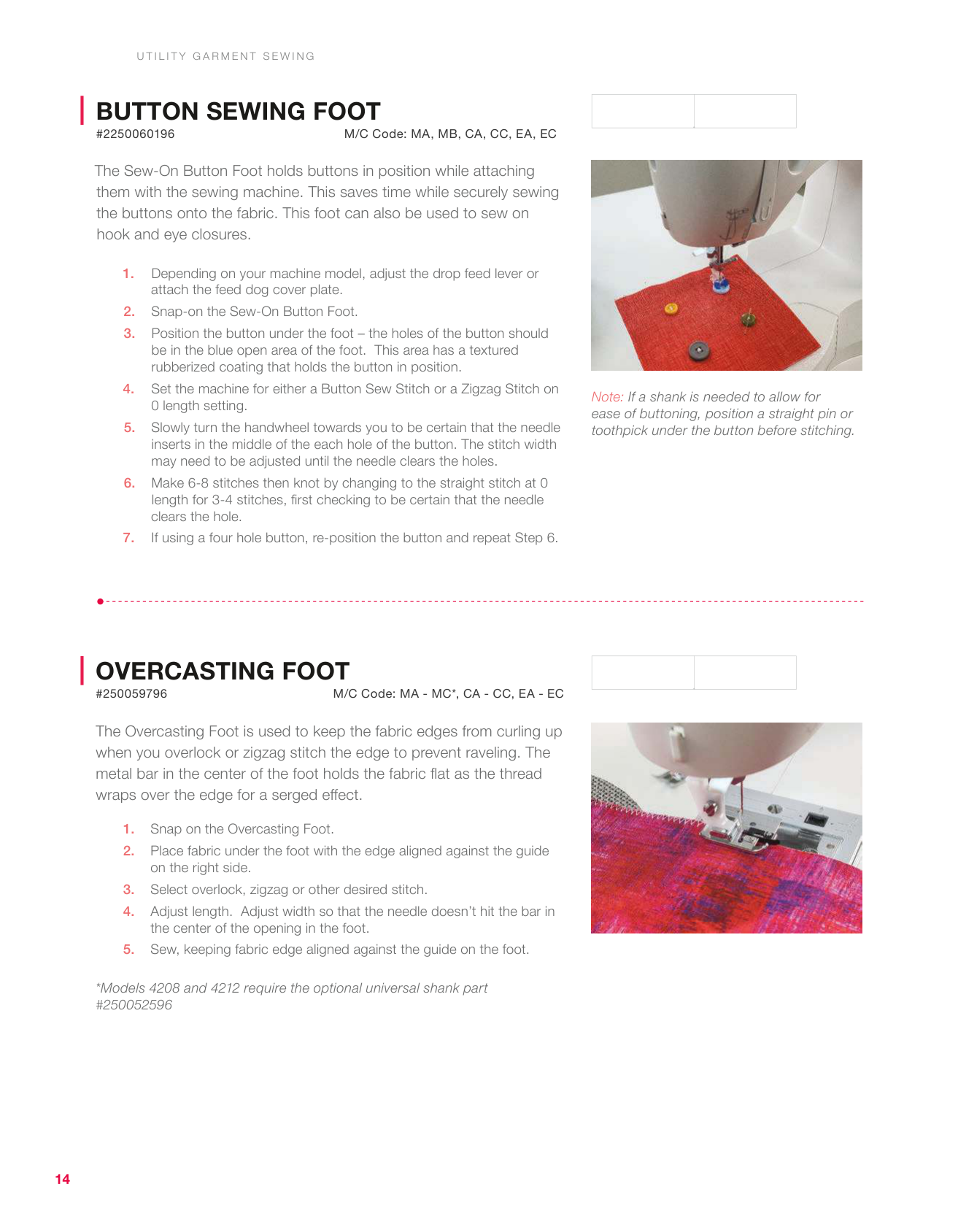 The Button Sewing Foot holds buttons in position while attaching them with your sewing machine, saving time while securely sewing buttons onto fabric. It can also be used for hook and eye closures. Position the button under the foot with its holes in the blue open area, set the machine for Button Sew Stitch or Zigzag at 0 length, and slowly turn the handwheel to check needle placement before making 6-8 stitches. (Page 14)