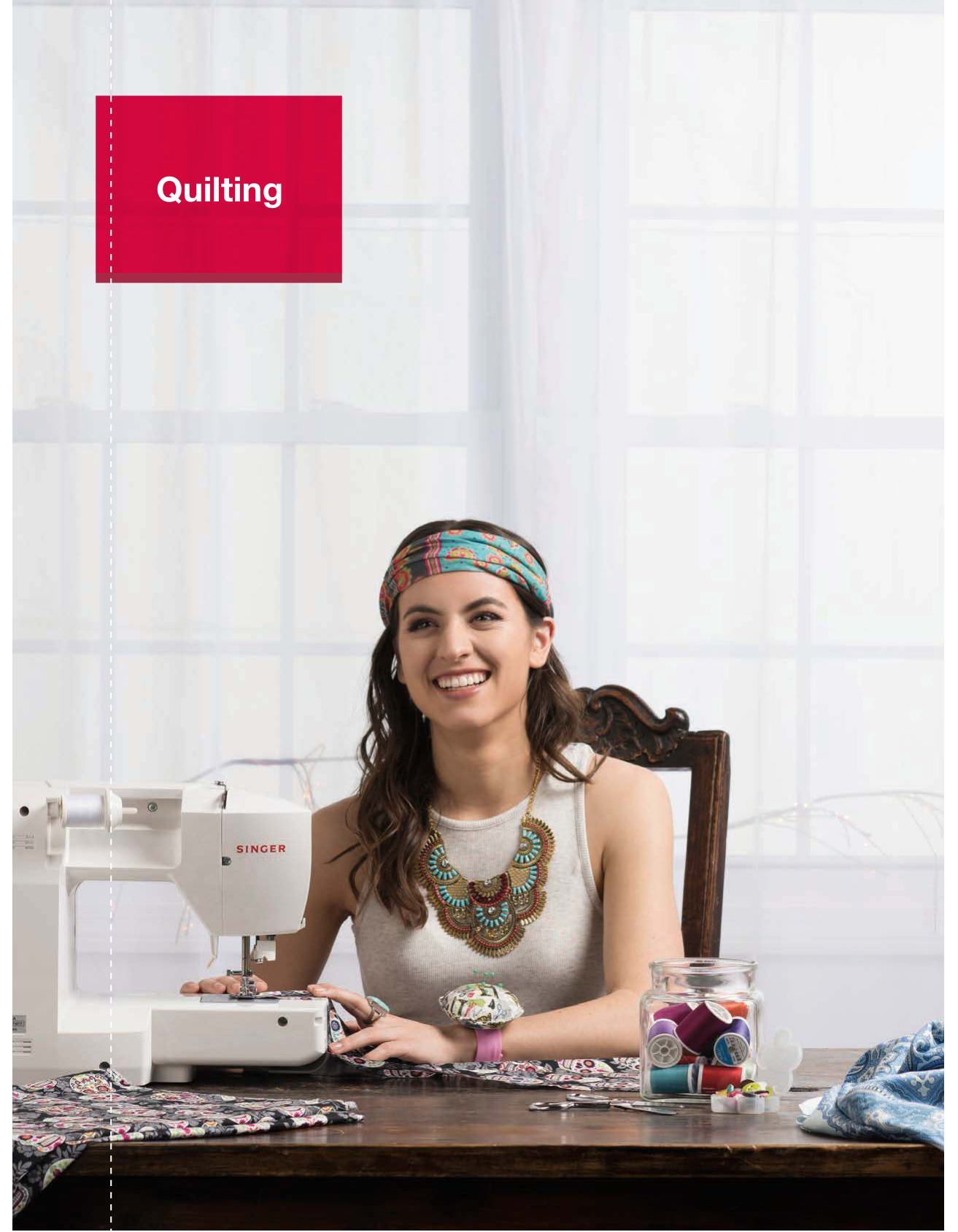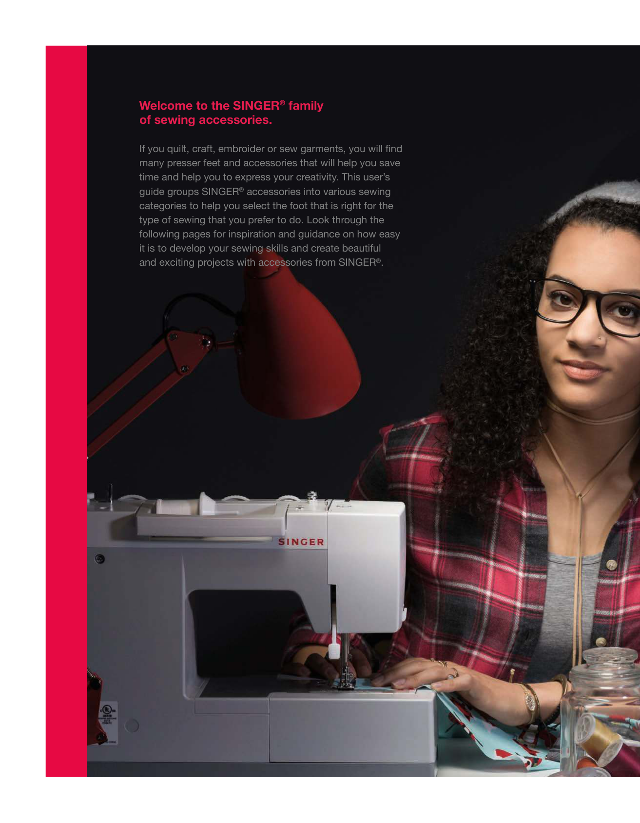 Welcome to the SINGER® family of sewing accessories. If you quilt, craft, embroider or sew garments, you will find many presser feet and accessories that will help you save time and help you to express your creativity. This user’s guide groups SINGER® accessories into various sewing categories to help you select the foot that is right for the type of sewing that you prefer to do. Look through the following pages for inspiration and guidance on how easy it is to develop your sewing skills and create beautiful and exciting projects with accessories from SINGER®.