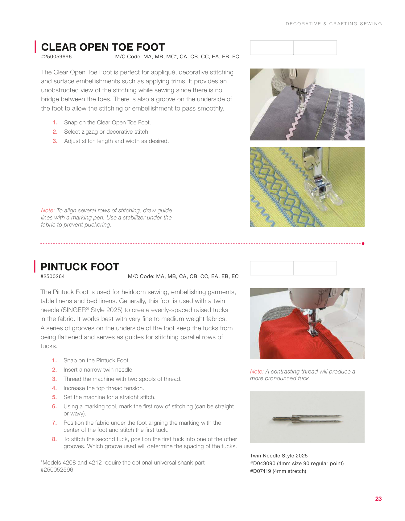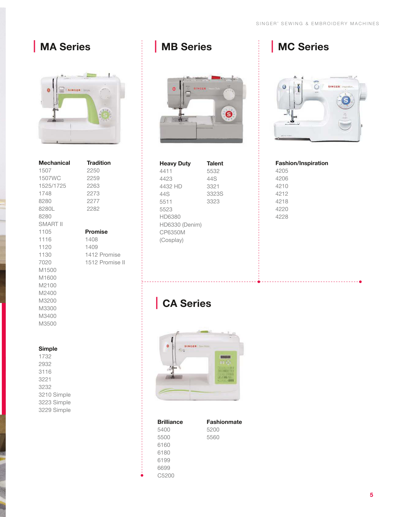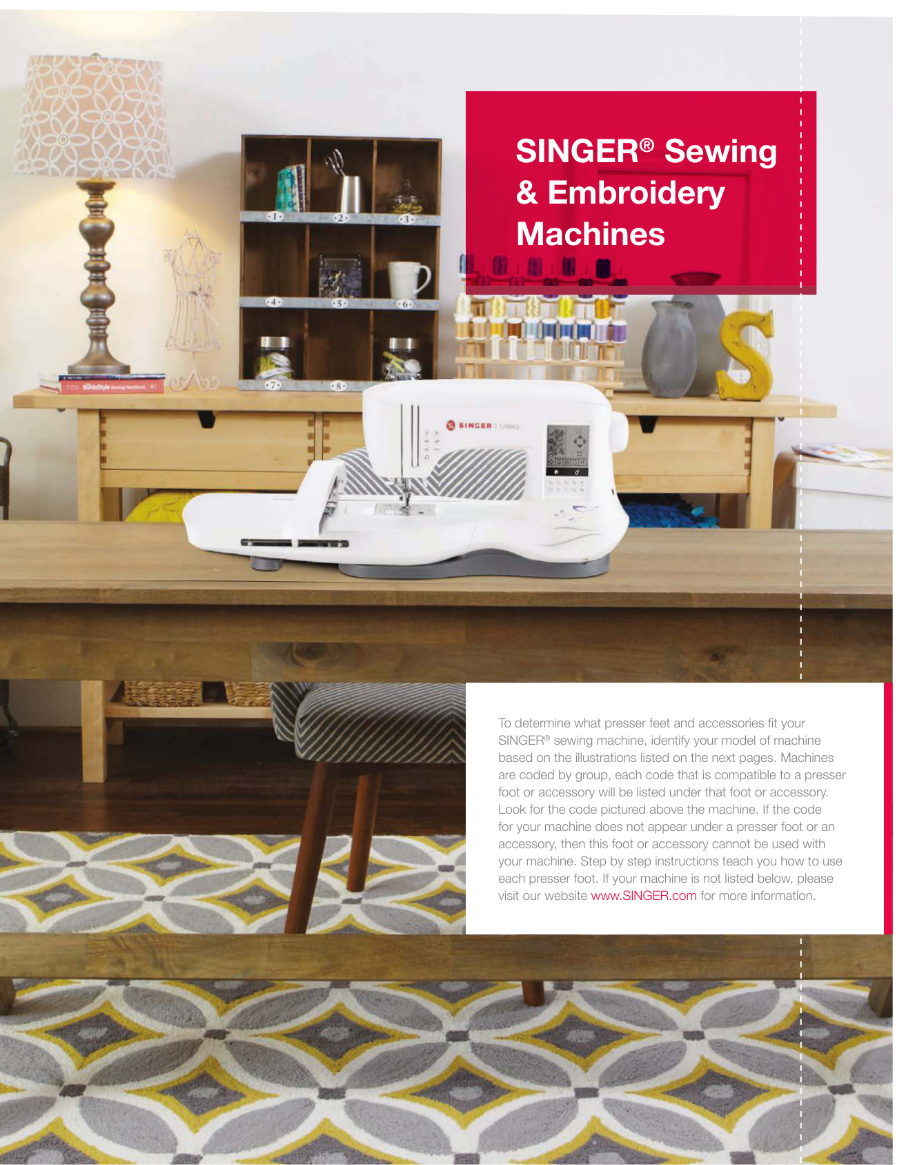 4 SINGER® Sewing & Embroidery Machines To determine what presser feet and accessories fit your SINGER® sewing machine, identify your model of machine based on the illustrations listed on the next pages. Machines are coded by group, each code that is compatible to a presser foot or accessory will be listed under that foot or accessory. Look for the code pictured above the machine. If the code for your machine does not appear under a presser foot or an accessory, then this foot or accessory cannot be used with your machine. Step by step instructions teach you how to use each presser foot. If your machine is not listed below, please visit our website www.SINGER.com for more information.