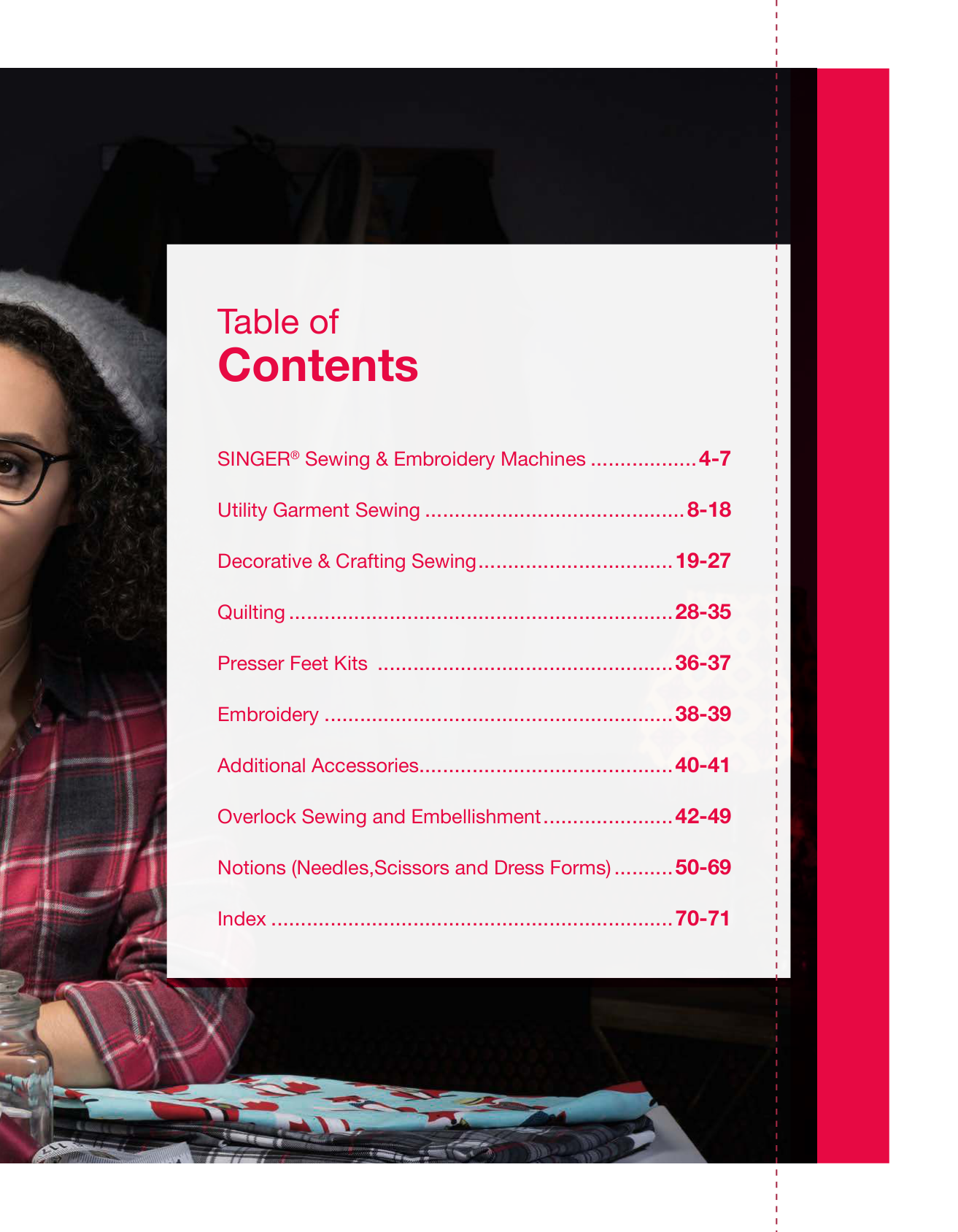 Table of Contents SINGER® Sewing & Embroidery Machines ..................4-7 Utility Garment Sewing ............................................8-18 Decorative & Crafting Sewing .................................19-27 Quilting .................................................................28-35 Presser Feet Kits ..................................................36-37