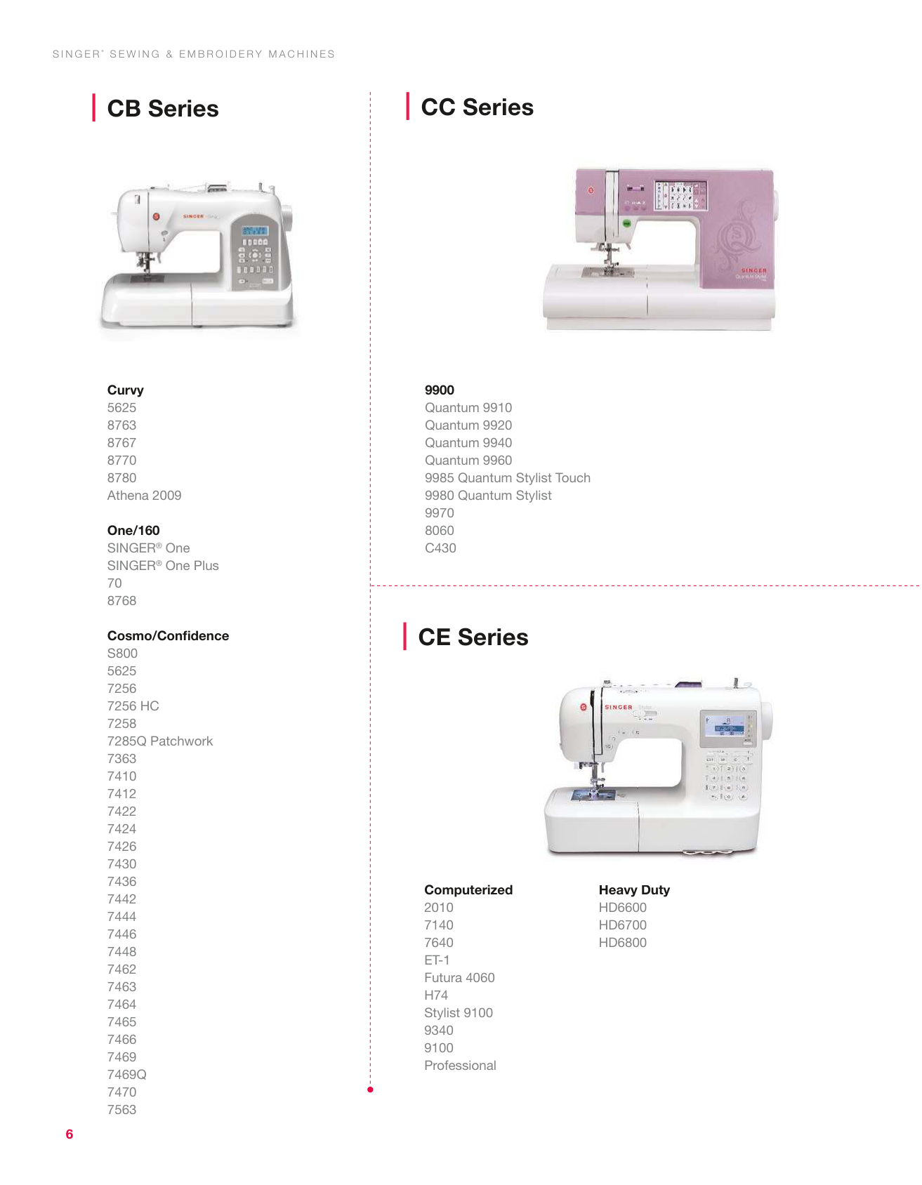 CC Series CE Series Curvy5625 8763 8767 8770 8780 Athena 2009 One/160 SINGER® One SINGER® One Plus 70 8768 Cosmo/Confidence