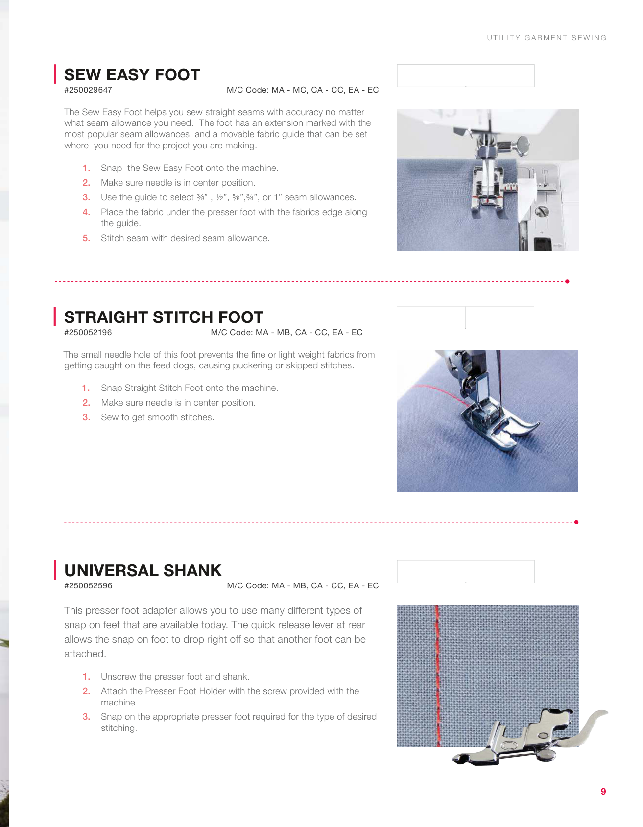 #250029647 M/C Code: MA - MC, CA - CC, EA - EC The Sew Easy Foot helps you sew straight seams with accuracy no matter what seam allowance you need. The foot has an extension marked with the most popular seam allowances, and a movable fabric guide that can be set where you need for the project you are making.U T I L I T Y G A R M E N T S E W I N G