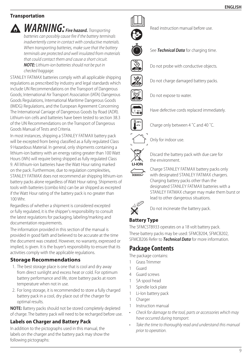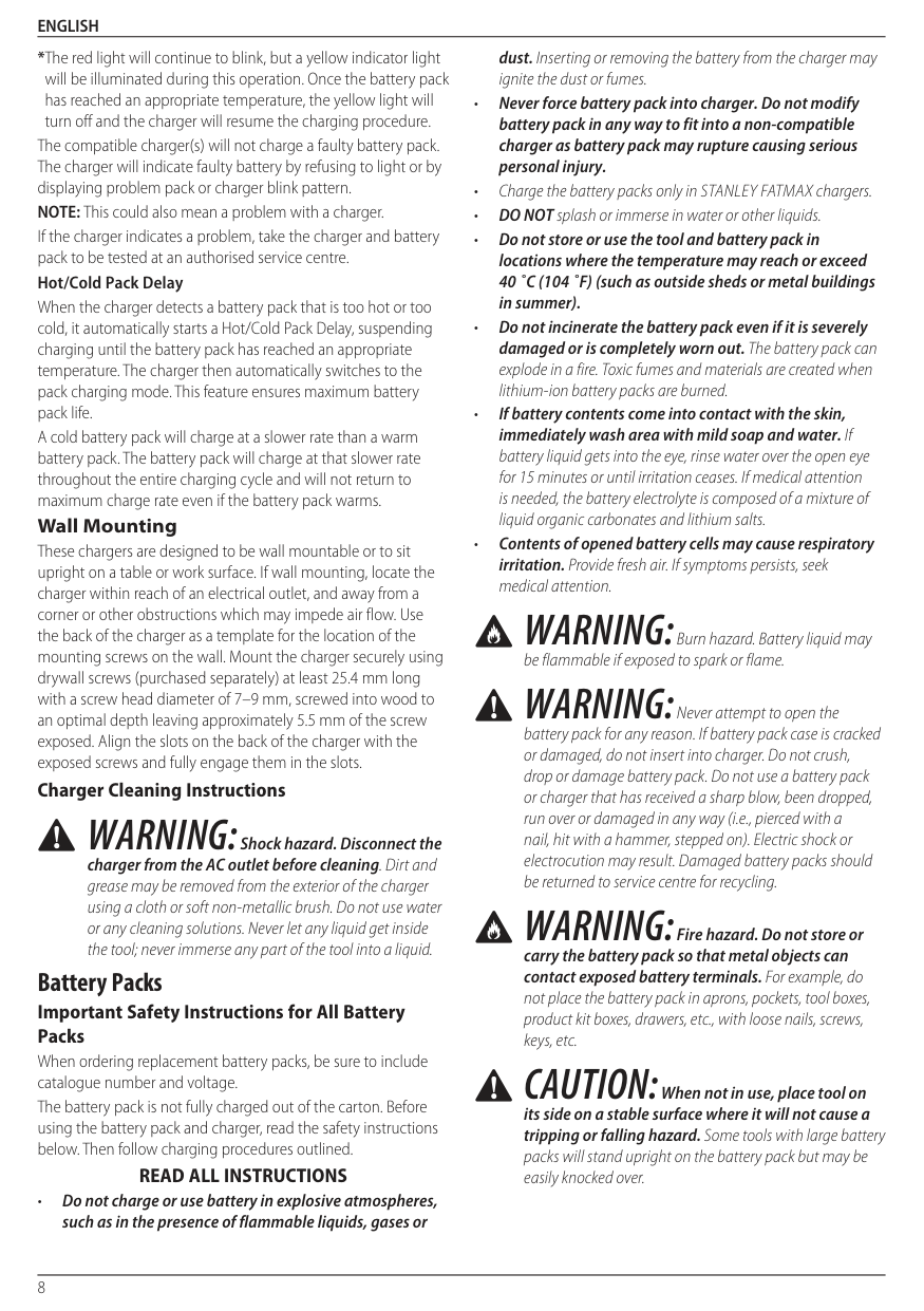 • Do not charge or use battery in explosive atmospheres, such as in the presence of flammable liquids, gases or dust. Inserting or removing the battery from the charger may ignite the dust or fumes. • Never force battery pack into charger. Do not modify battery pack in any way to fit into a non-compatible charger as battery pack may rupture causing serious personal injury. • Charge the battery packs only in STANLEY FATMAX chargers. • DO NOT splash or immerse in water or other liquids. • Do not store or use the tool and battery pack in locations where the temperature may reach or exceed 40 ˚C (104 ˚F) (such as outside sheds or metal buildings in summer). • Do not incinerate the battery pack even if it is severely damaged or is completely worn out. The battery pack can explode in a fire. Toxic fumes and materials are created when lithium-ion battery packs are burned. • If battery contents come into contact with the skin, immediately wash area with mild soap and water. If battery liquid gets into the eye, rinse water over the open eye for 15 minutes or until irritation ceases. If medical attention is needed, the battery electrolyte is composed of a mixture of liquid organic carbonates and lithium salts. • Contents of opened battery cells may cause respiratory irritation. Provide fresh air. If symptoms persists, seek medical attention. WARNING: Burn hazard. Battery liquid may be flammable if exposed to spark or flame. WARNING: Never attempt to open the battery pack for any reason. If battery pack case is cracked or damaged, do not insert into charger. Do not crush, drop or damage battery pack. Do not use a battery pack or charger that has received a sharp blow, been dropped, run over or damaged in any way (i.e., pierced with a nail, hit with a hammer, stepped on). Electric shock or electrocution may result. Damaged battery packs should be returned to service centre for recycling. WARNING: Fire hazard. Do not store or carry the battery pack so that metal objects can contact exposed battery terminals. For example, do not place the battery pack in aprons, pockets, tool boxes, product kit boxes, drawers, etc., with loose nails, screws, keys, etc. CAUTION: When not in use, place tool on its side on a stable surface where it will not cause a tripping or falling hazard. Some tools with large battery packs will stand upright on the battery pack but may be easily knocked over.9 English Transportation WARNING: Fire hazard. Transporting batteries can possibly cause fire if the battery terminals inadvertently come in contact with conductive materials. When transporting batteries, make sure that the battery terminals are protected and well insulated from materials that could contact them and cause a short circuit. NOTE: Lithium-ion batteries should not be put in checked baggage. STANLEY FATMAX batteries comply with all applicable shipping regulations as prescribed by industry and legal standards which include UN Recommendations on the Transport of Dangerous Goods; International Air Transport Association (IATA) Dangerous Goods Regulations, International Maritime Dangerous Goods (IMDG) Regulations, and the European Agreement Concerning The International Carriage of Dangerous Goods by Road (ADR). Lithium-ion cells and batteries have been tested to section 38.3 of the UN Recommendations on the Transport of Dangerous Goods Manual of Tests and Criteria. In most instances, shipping a STANLEY FATMAX battery pack will be excepted from being classified as a fully regulated Class 9 Hazardous Material. In general, only shipments containing a lithium-ion battery with an energy rating greater than 100 Watt Hours (Wh) will require being shipped as fully regulated Class