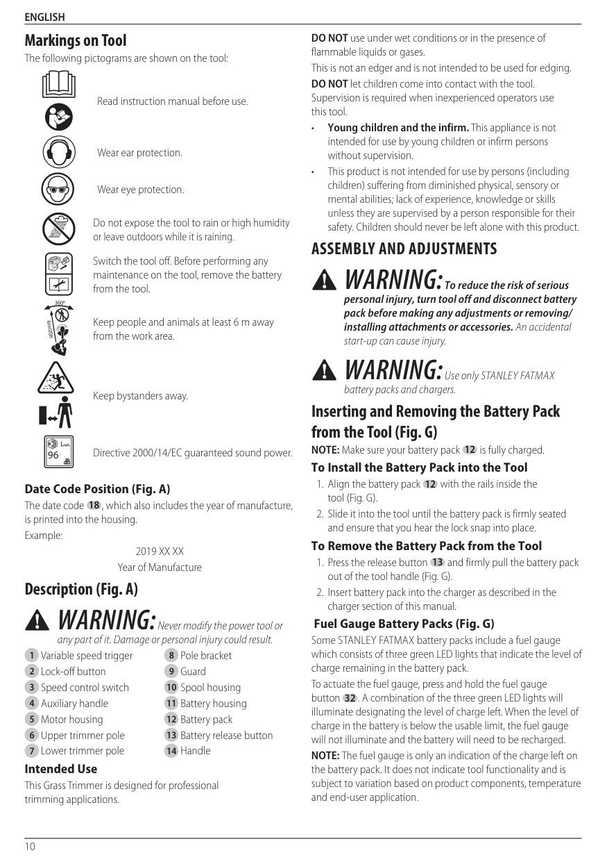 WARNING: To reduce the risk of serious personal injury, turn tool off and disconnect battery pack before making any adjustments or removing/ installing attachments or accessories. An accidental start-up can cause injury. WARNING: Use only STANLEY FATMAX battery packs and chargers. Inserting and Removing the Battery Pack from the Tool (Fig. G) NOTE: Make sure your battery pack 12 is fully charged. To Install the Battery Pack into the Tool11 English Attaching Spool Assembly (Fig. B, C) Use STANLEY FATMAX replacement spool STZST1169.