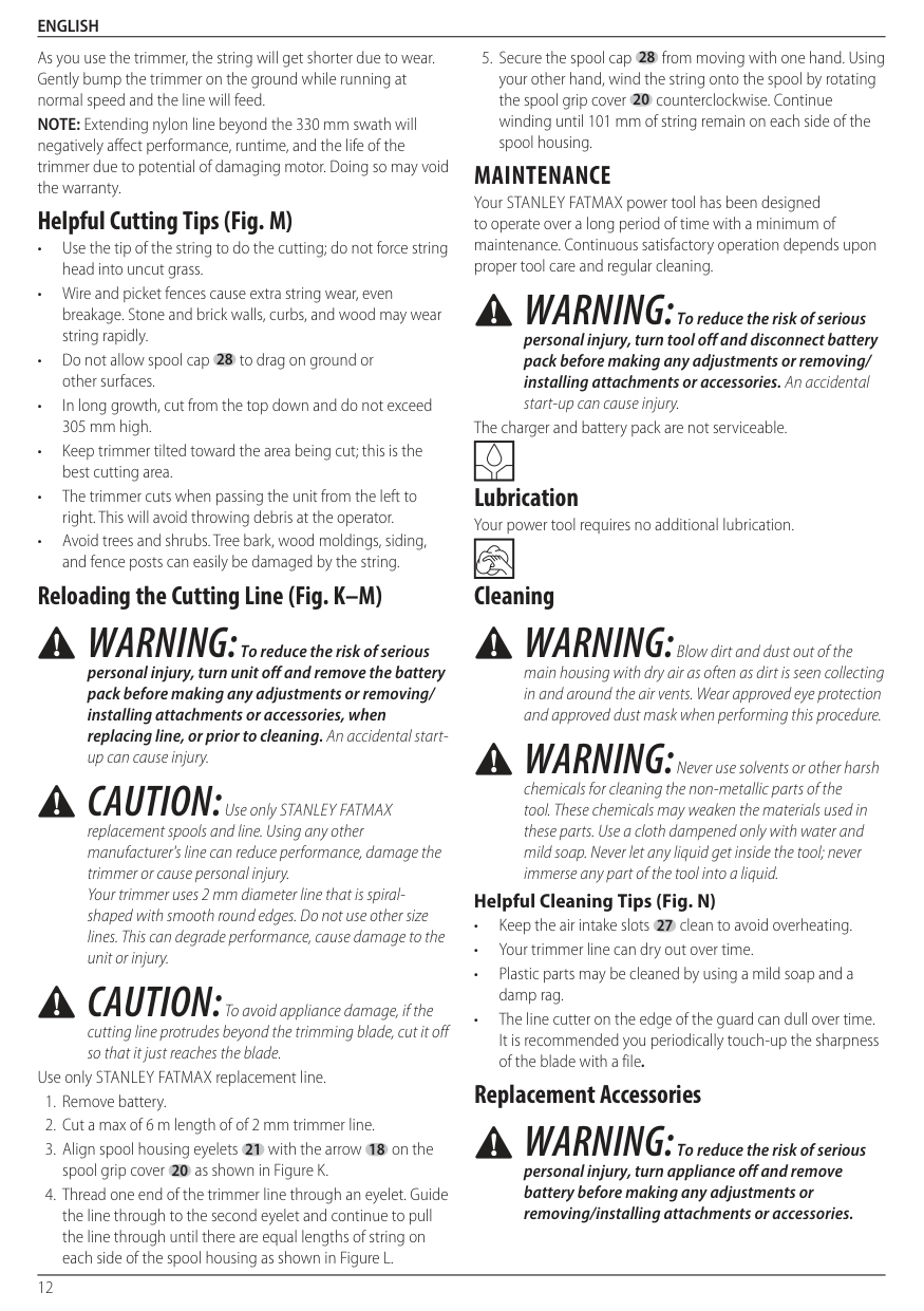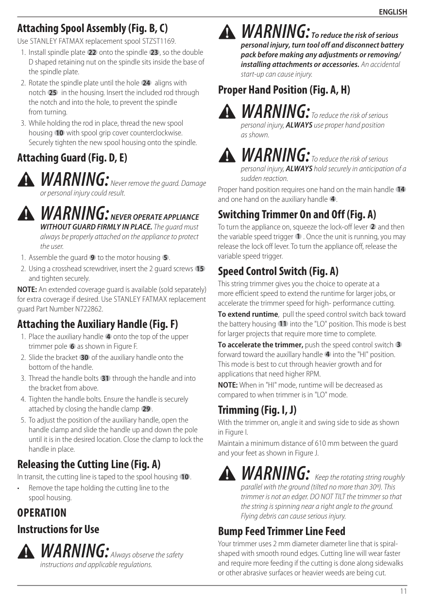 Instructions for Use WARNING: Always observe the safety instructions and applicable regulations. WARNING: To reduce the risk of serious personal injury, turn tool off and disconnect battery pack before making any adjustments or removing/ installing attachments or accessories. An accidental start-up can cause injury. Proper Hand Position (Fig. A, H) WARNING: To reduce the risk of serious personal injury, ALWAYS use proper hand position as shown. WARNING: To reduce the risk of serious personal injury, ALWAYS hold securely in anticipation of a sudden reaction. Proper hand position requires one hand on the main handle 14 and one hand on the auxiliary handle 4 . Switching Trimmer On and Off (Fig. A) To turn the appliance on, squeeze the lock-off lever 2 and then the variable speed trigger 1 . Once the unit is running, you may release the lock off lever. To turn the appliance off, release the variable speed trigger. Speed Control Switch (Fig. A) This string trimmer gives you the choice to operate at a more efficient speed to extend the runtime for larger jobs, or accelerate the trimmer speed for high- performance cutting. To extend runtime, pull the speed control switch back toward the battery housing 11 into the "LO" position. This mode is best for larger projects that require more time to complete. To accelerate the trimmer, push the speed control switch 3 forward toward the auxillary handle 4 into the "HI" position. This mode is best to cut through heavier growth and for applications that need higher RPM. NOTE: When in "HI" mode, runtime will be decreased as compared to when trimmer is in "LO" mode. Trimming (Fig. I, J) With the trimmer on, angle it and swing side to side as shown in Figure I. Maintain a minimum distance of 610 mm between the guard and your feet as shown in Figure J. WARNING: Keep the rotating string roughly parallel with the ground (tilted no more than 30º). This trimmer is not an edger. DO NOT TILT the trimmer so that the string is spinning near a right angle to the ground. Flying debris can cause serious injury. Bump Feed Trimmer Line Feed Your trimmer uses 2 mm diameter diameter line that is spiral- shaped with smooth round edges. Cutting line will wear faster and require more feeding if the cutting is done along sidewalks or other abrasive surfaces or heavier weeds are being cut.12 English As you use the trimmer, the string will get shorter due to wear. Gently bump the trimmer on the ground while running at normal speed and the line will feed. NOTE: Extending nylon line beyond the 330 mm swath will negatively affect performance, runtime, and the life of the trimmer due to potential of damaging motor. Doing so may void the warranty. Helpful Cutting Tips (Fig. M) • Use the tip of the string to do the cutting; do not force string head into uncut grass. • Wire and picket fences cause extra string wear, even breakage. Stone and brick walls, curbs, and wood may wear string rapidly. • Do not allow spool cap 28 to drag on ground or other surfaces. • In long growth, cut from the top down and do not exceed 305 mm high. • Keep trimmer tilted toward the area being cut; this is the best cutting area. • The trimmer cuts when passing the unit from the left to right. This will avoid throwing debris at the operator. • Avoid trees and shrubs. Tree bark, wood moldings, siding, and fence posts can easily be damaged by the string. Reloading the Cutting Line (Fig. K–M) WARNING: To reduce the risk of serious personal injury, turn unit off and remove the battery pack before making any adjustments or removing/ installing attachments or accessories, when replacing line, or prior to cleaning. An accidental start- up can cause injury. CAUTION: Use only STANLEY FATMAX replacement spools and line. Using any other manufacturer's line can reduce performance, damage the trimmer or cause personal injury. Your trimmer uses 2 mm diameter line that is spiral- shaped with smooth round edges. Do not use other size lines. This can degrade performance, cause damage to the unit or injury. CAUTION: To avoid appliance damage, if the cutting line protrudes beyond the trimming blade, cut it off so that it just reaches the blade. Use only STANLEY FATMAX replacement line.