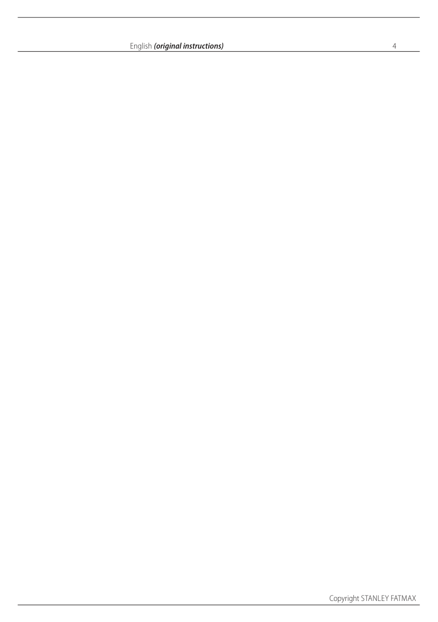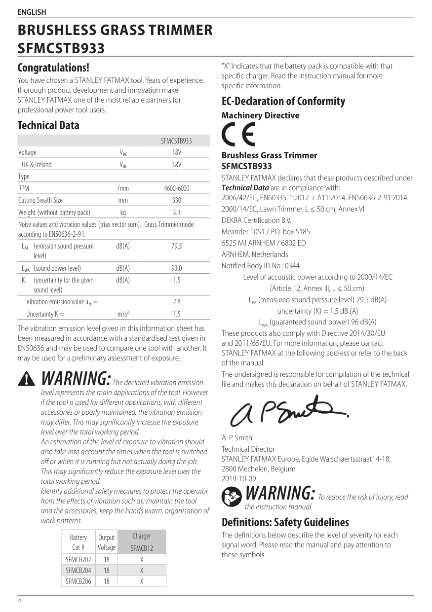 ARNHEM, Netherlands Notified Body ID No.: 0344 Level of accoustic power according to 2000/14/EC (Article 12, Annex III, L ≤ 50 cm): LPA (measured sound pressure level) 79.5 dB(A) uncertainty (K) = 1.5 dB (A) LWA (guaranteed sound power) 96 dB(A) These products also comply with Directive 2014/30/EU and 2011/65/EU. For more information, please contact STANLEY FATMAX at the following address or refer to the back of the manual. The undersigned is responsible for compilation of the technical file and makes this declaration on behalf of STANLEY FATMAX. A. P. Smith Technical Director STANLEY FATMAX Europe, Egide Walschaertsstraat14-18, 2800 Mechelen, Belgium 2019-10-09 WARNING: To reduce the risk of injury, read the instruction manual. Definitions: Safety Guidelines The definitions below describe the level of severity for each signal word. Please read the manual and pay attention to these symbols. Congratulations! You have chosen a STANLEY FATMAX tool. Years of experience, thorough product development and innovation make STANLEY FATMAX one of the most reliable partners for professional power tool users. Technical DataSfmcstb933