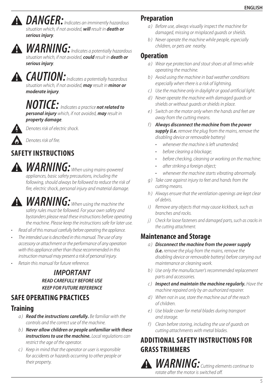 Training a ) Read the instructions carefully. Be familiar with the controls and the correct use of the machine. b ) Never allow children or people unfamiliar with these instructions to use the machine. Local regulations can restrict the age of the operator. c ) Keep in mind that the operator or user is responsible for accidents or hazards occurring to other people or their property. Preparation a ) Before use, always visually inspect the machine for damaged, missing or misplaced guards or shields. b ) Never operate the machine while people, especially children, or pets are nearby. Operation a ) Wear eye protection and stout shoes at all times while operating the machine. b ) Avoid using the machine in bad weather conditions especially when there is a risk of lightning. c ) Use the machine only in daylight or good artificial light. d ) Never operate the machine with damaged guards or shields or without guards or shields in place. e ) Switch on the motor only when the hands and feet are away from the cutting means. f ) Always disconnect the machine from the power supply (i.e. remove the plug from the mains, remove the disabling device or removable battery) • whenever the machine is left unattended; • before clearing a blockage; • before checking, cleaning or working on the machine; • after striking a foreign object; • whenever the machine starts vibrating abnormally. g ) Take care against injury to feet and hands from the cutting means. h ) Always ensure that the ventilation openings are kept clear of debris. i ) Remove any objects that may cause kickback, such as branches and rocks. j ) Check for loose fasteners and damaged parts, such as cracks in the cutting attachment. Maintenance and Storage a ) Disconnect the machine from the power supply (i.e. remove the plug from the mains, remove the disabling device or removable battery) before carrying out maintenance or cleaning work. b ) Use only the manufacturer’s recommended replacement parts and accessories. c ) Inspect and maintain the machine regularly. Have the machine repaired only by an authorized repairer. d ) When not in use, store the machine out of the reach of children. e ) Use blade cover for metal blades during transport and storage. f ) Clean before storing, including the use of guards on cutting attachments with metal blades.Additional Safety Instructions For