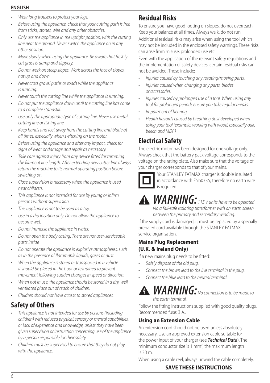 WARNING: Cutting elements continue to rotate after the motor is switched off.6 English • Wear long trousers to protect your legs. • Before using the appliance, check that your cutting path is free from sticks, stones, wire and any other obstacles. • Only use the appliance in the upright position, with the cutting line near the ground. Never switch the appliance on in any other position. • Move slowly when using the appliance. Be aware that freshly cut grass is damp and slippery. • Do not work on steep slopes. Work across the face of slopes, not up and down. • Never cross gravel paths or roads while the appliance is running. • Never touch the cutting line while the appliance is running. • Do not put the appliance down until the cutting line has come to a complete standstill. • Use only the appropriate type of cutting line. Never use metal cutting line or fishing line. • Keep hands and feet away from the cutting line and blade at all times, especially when switching on the motor. • Before using the appliance and after any impact, check for signs of wear or damage and repair as necessary. • Take care against injury from any device fitted for trimming the filament line length. After extending new cutter line always return the machine to its normal operating position before switching on. • Close supervision is necessary when the appliance is used near children. • This appliance is not intended for use by young or infirm persons without supervision. • This appliance is not to be used as a toy. • Use in a dry location only. Do not allow the appliance to become wet. • Do not immerse the appliance in water. • Do not open the body casing. There are not user-serviceable parts inside • Do not operate the appliance in explosive atmospheres, such as in the presence of flammable liquids, gases or dust. • When the appliance is stored or transported in a vehicle it should be placed in the boot or restrained to prevent movement following sudden changes in speed or direction. • When not in use, the appliance should be stored in a dry, well ventilated place out of reach of children. • Children should not have access to stored appliances. Safety of Others • This appliance is not intended for use by persons (including children) with reduced physical, sensory or mental capabilities, or lack of experience and knowledge, unless they have been given supervision or instruction concerning use of the appliance by a person responsible for their safety. • Children must be supervised to ensure that they do not play with the appliance. Residual Risks To ensure you have good footing on slopes, do not overreach. Keep your balance at all times. Always walk, do not run. Additional residual risks may arise when using the tool which may not be included in the enclosed safety warnings. These risks can arise from misuse, prolonged use etc. Even with the application of the relevant safety regulations and the implementation of safety devices, certain residual risks can not be avoided. These include: • Injuries caused by touching any rotating/moving parts. • Injuries caused when changing any parts, blades or accessories. • Injuries caused by prolonged use of a tool. When using any tool for prolonged periods ensure you take regular breaks. • Impairment of hearing. • Health hazards caused by breathing dust developed when using your tool (example: working with wood, especially oak, beech and MDF.) Electrical Safety The electric motor has been designed for one voltage only. Always check that the battery pack voltage corresponds to the voltage on the rating plate. Also make sure that the voltage of your charger corresponds to that of your mains. Your STANLEY FATMAX charger is double insulated in accordance with EN60335; therefore no earth wire is required. WARNING: 115 V units have to be operated via a fail-safe isolating transformer with an earth screen between the primary and secondary winding. If the supply cord is damaged, it must be replaced by a specially prepared cord available through the STANLEY FATMAX service organisation. Mains Plug Replacement (U.K. & Ireland Only) If a new mains plug needs to be fitted: • Safely dispose of the old plug. • Connect the brown lead to the live terminal in the plug. • Connect the blue lead to the neutral terminal. WARNING: No connection is to be made to the earth terminal. Follow the fitting instructions supplied with good quality plugs. Recommended fuse: 3 A.. Using an Extension Cable An extension cord should not be used unless absolutely necessary. Use an approved extension cable suitable for the power input of your charger (see Technical Data). The minimum conductor size is 1 mm2; the maximum length is 30 m. When using a cable reel, always unwind the cable completely.