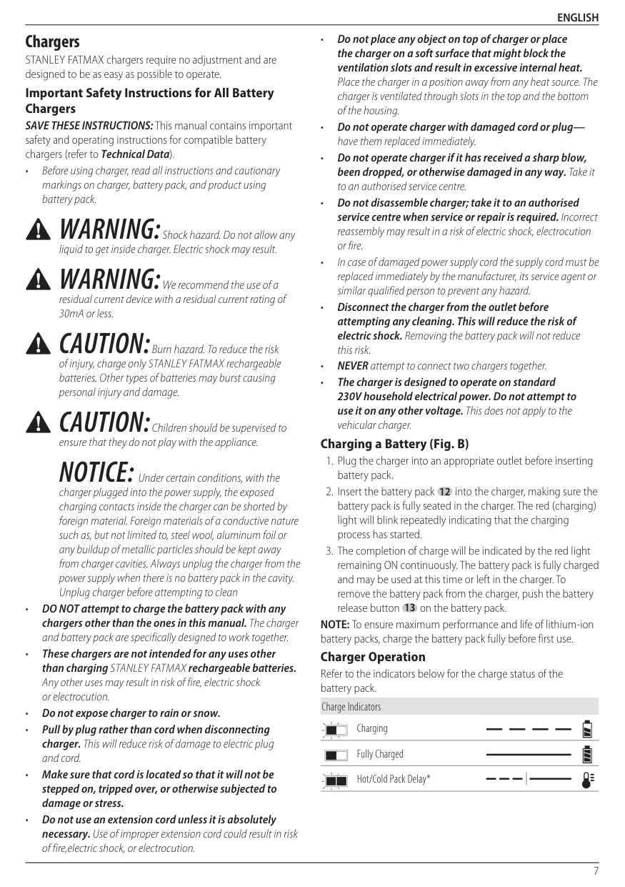 7 English Chargers STANLEY FATMAX chargers require no adjustment and are designed to be as easy as possible to operate. Important Safety Instructions for All Battery Chargers SAVE THESE INSTRUCTIONS: This manual contains important safety and operating instructions for compatible battery chargers (refer to Technical Data). • Before using charger, read all instructions and cautionary markings on charger, battery pack, and product using battery pack. WARNING: Shock hazard. Do not allow any liquid to get inside charger. Electric shock may result. WARNING: We recommend the use of a residual current device with a residual current rating of 30mA or less. CAUTION: Burn hazard. To reduce the risk of injury, charge only STANLEY FATMAX rechargeable batteries. Other types of batteries may burst causing personal injury and damage. CAUTION: Children should be supervised to ensure that they do not play with the appliance. NOTICE: Under certain conditions, with the charger plugged into the power supply, the exposed charging contacts inside the charger can be shorted by foreign material. Foreign materials of a conductive nature such as, but not limited to, steel wool, aluminum foil or any buildup of metallic particles should be kept away from charger cavities. Always unplug the charger from the power supply when there is no battery pack in the cavity. Unplug charger before attempting to clean • DO NOT attempt to charge the battery pack with any chargers other than the ones in this manual. The charger and battery pack are specifically designed to work together. • These chargers are not intended for any uses other than charging STANLEY FATMAX rechargeable batteries. Any other uses may result in risk of fire, electric shock or electrocution. • Do not expose charger to rain or snow. • Pull by plug rather than cord when disconnecting charger. This will reduce risk of damage to electric plug and cord. • Make sure that cord is located so that it will not be stepped on, tripped over, or otherwise subjected to damage or stress. • Do not use an extension cord unless it is absolutely necessary. Use of improper extension cord could result in risk of fire,electric shock, or electrocution. • Do not place any object on top of charger or place the charger on a soft surface that might block the ventilation slots and result in excessive internal heat. Place the charger in a position away from any heat source. The charger is ventilated through slots in the top and the bottom of the housing. • Do not operate charger with damaged cord or plug— have them replaced immediately. • Do not operate charger if it has received a sharp blow, been dropped, or otherwise damaged in any way. Take it to an authorised service centre. • Do not disassemble charger; take it to an authorised service centre when service or repair is required. Incorrect reassembly may result in a risk of electric shock, electrocution or fire. • In case of damaged power supply cord the supply cord must be replaced immediately by the manufacturer, its service agent or similar qualified person to prevent any hazard. • Disconnect the charger from the outlet before attempting any cleaning. This will reduce the risk of electric shock. Removing the battery pack will not reduce this risk. • NEVER attempt to connect two chargers together. • The charger is designed to operate on standard 230V household electrical power. Do not attempt to use it on any other voltage. This does not apply to the vehicular charger. Charging a Battery (Fig. B)