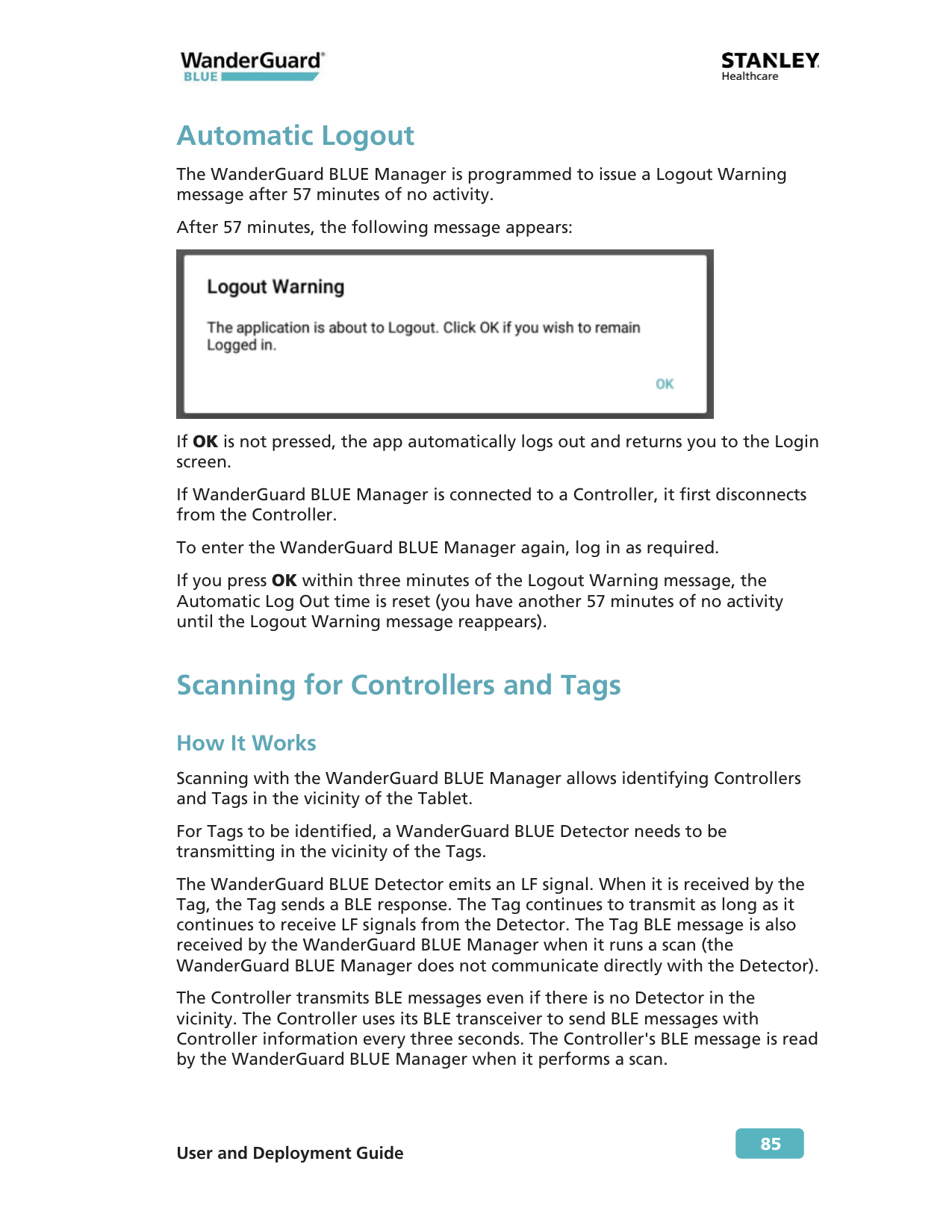 If OK is not pressed, the app automatically logs out and returns you to the Login screen. If WanderGuard BLUE Manager is connected to a Controller, it first disconnects from the Controller. To enter the WanderGuard BLUE Manager again, log in as required. If you press OK within three minutes of the Logout Warning message, the Automatic Log Out time is reset (you have another 57 minutes of no activity until the Logout Warning message reappears). Scanning for Controllers and Tags How It Works Scanning with the WanderGuard BLUE Manager allows identifying Controllers and Tags in the vicinity of the Tablet. For Tags to be identified, a WanderGuard BLUE Detector needs to be transmitting in the vicinity of the Tags. The WanderGuard BLUE Detector emits an LF signal. When it is received by the Tag, the Tag sends a BLE response. The Tag continues to transmit as long as it continues to receive LF signals from the Detector. The Tag BLE message is also received by the WanderGuard BLUE Manager when it runs a scan (the WanderGuard BLUE Manager does not communicate directly with the Detector). The Controller transmits BLE messages even if there is no Detector in the vicinity. The Controller uses its BLE transceiver to send BLE messages with Controller information every three seconds. The Controller's BLE message is read by the WanderGuard BLUE Manager when it performs a scan.