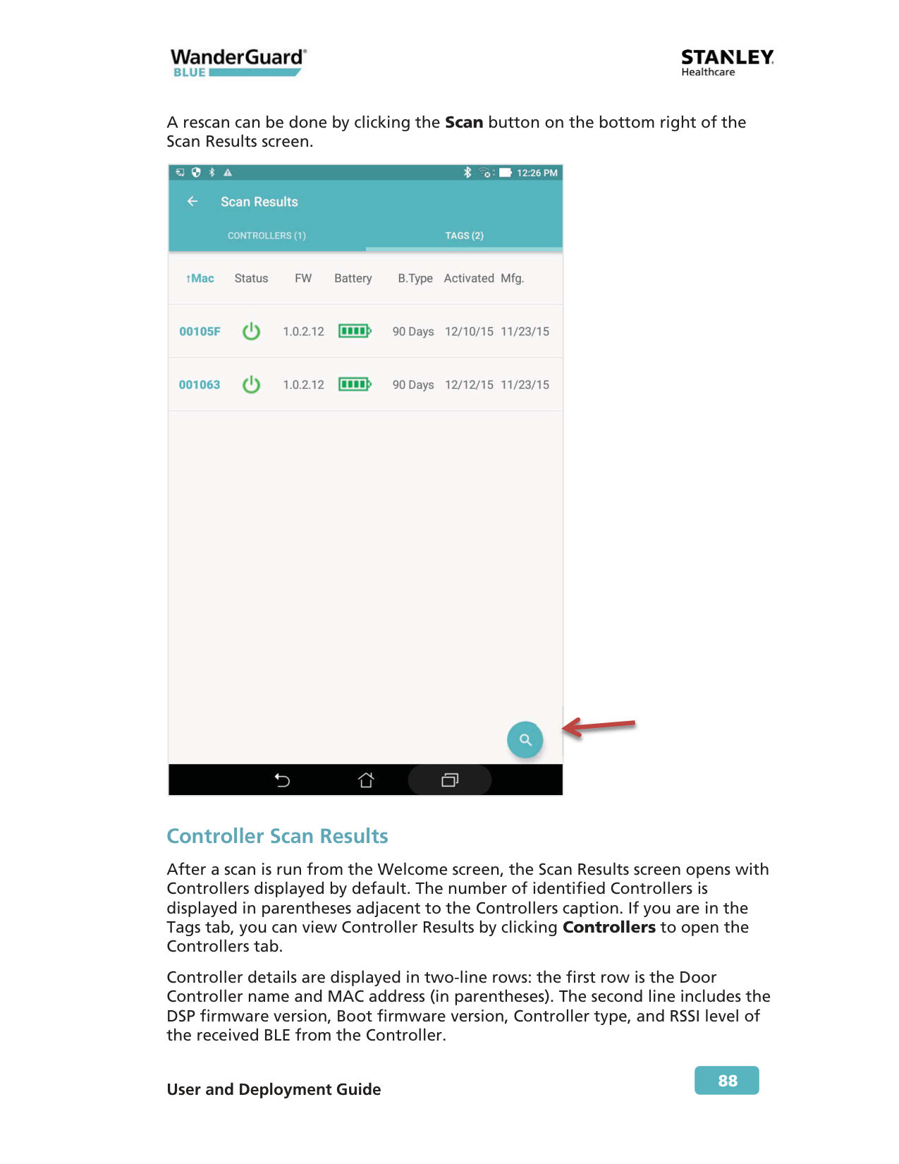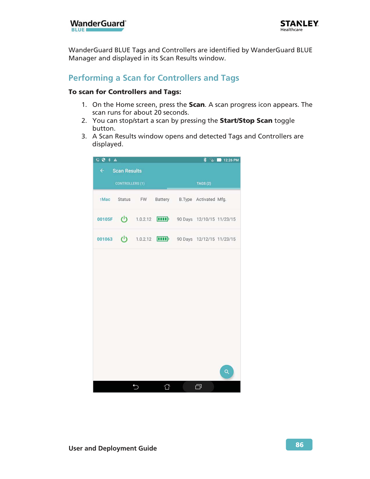 86 WanderGuard BLUE Tags and Controllers are identified by WanderGuard BLUE Manager and displayed in its Scan Results window. Performing a Scan for Controllers and Tags To scan for Controllers and Tags: