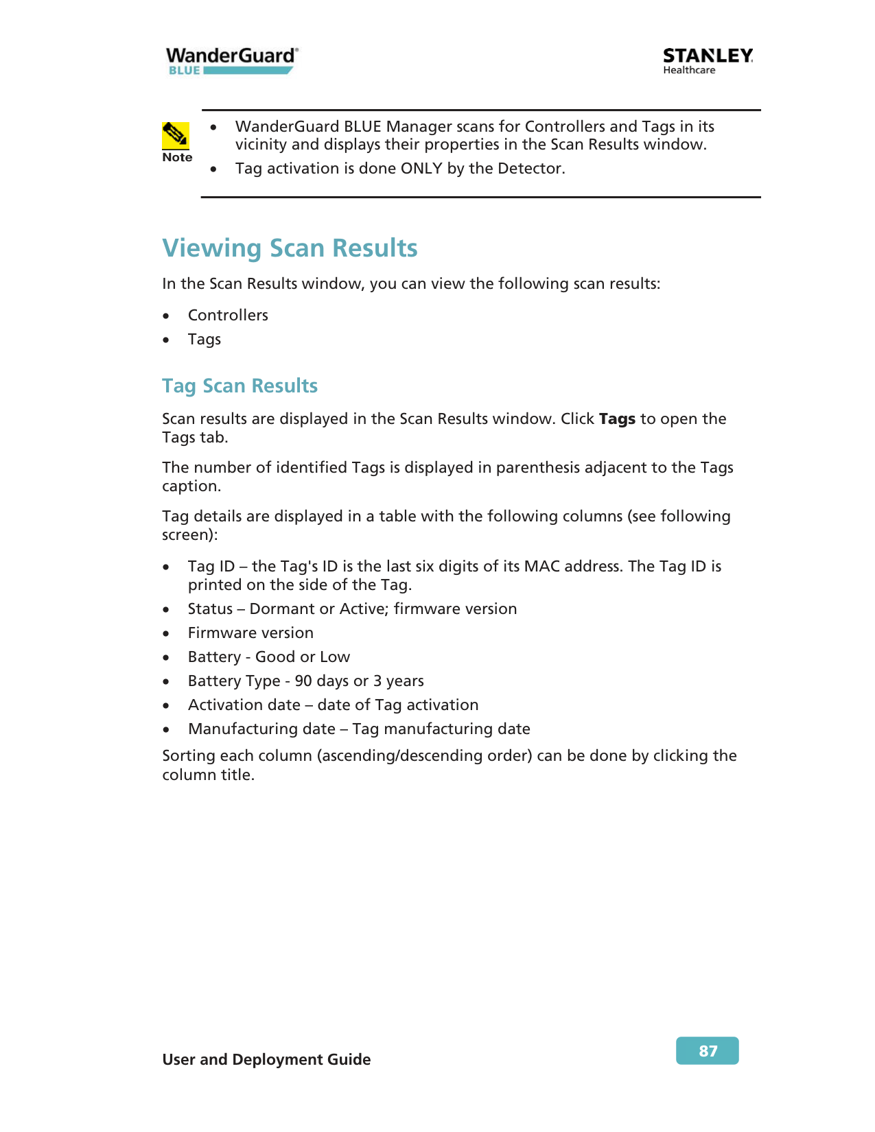 x WanderGuard BLUE Manager scans for Controllers and Tags in its vicinity and displays their properties in the Scan Results window. x Tag activation is done ONLY by the Detector. Viewing Scan Results In the Scan Results window, you can view the following scan results: x Controllers x Tags Tag Scan Results Scan results are displayed in the Scan Results window. Click Tags to open the Tags tab. The number of identified Tags is displayed in parenthesis adjacent to the Tags caption. Tag details are displayed in a table with the following columns (see following screen): x Tag ID – the Tag's ID is the last six digits of its MAC address. The Tag ID is printed on the side of the Tag. x Status – Dormant or Active; firmware version x Firmware version x Battery - Good or Low x Battery Type - 90 days or 3 years x Activation date – date of Tag activation x Manufacturing date – Tag manufacturing date Sorting each column (ascending/descending order) can be done by clicking the column title.