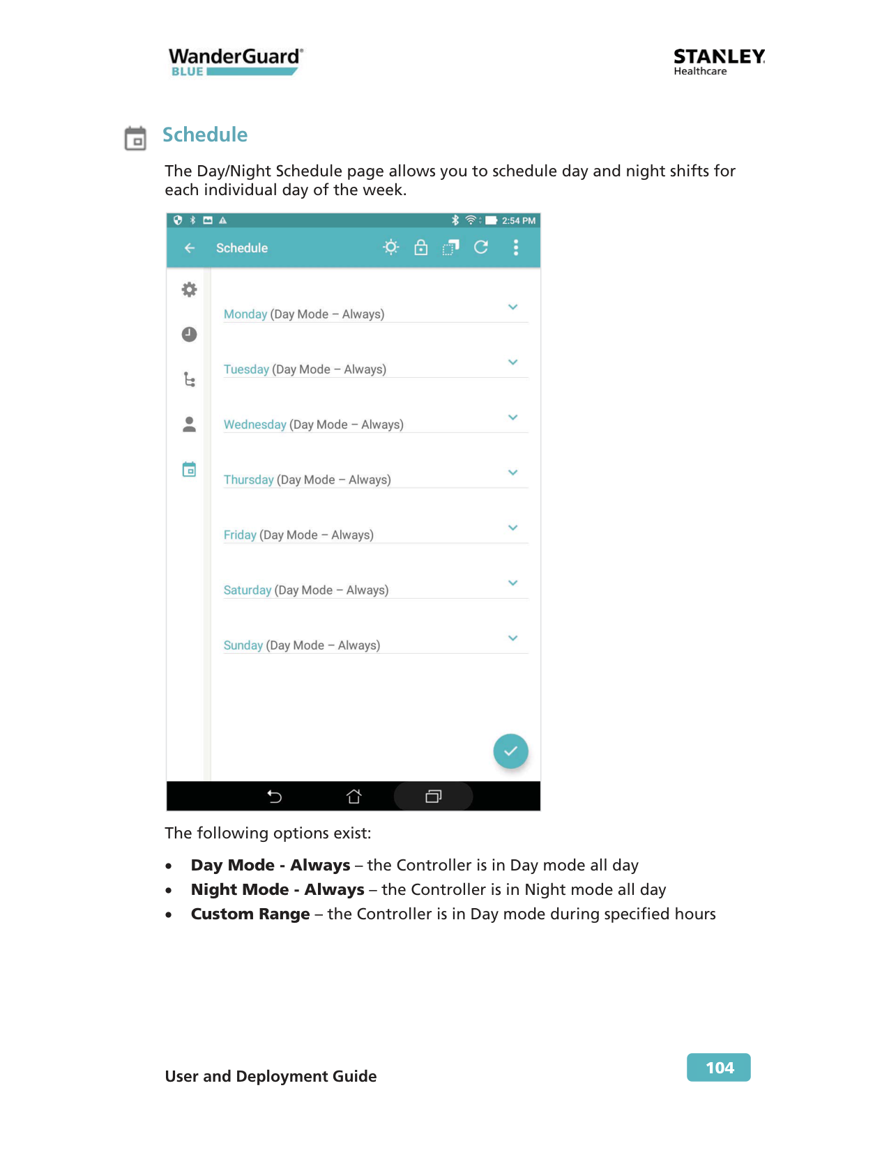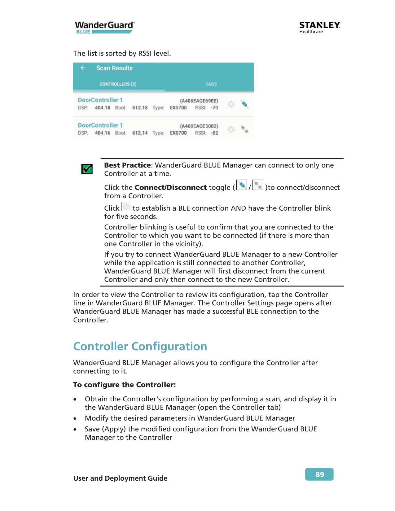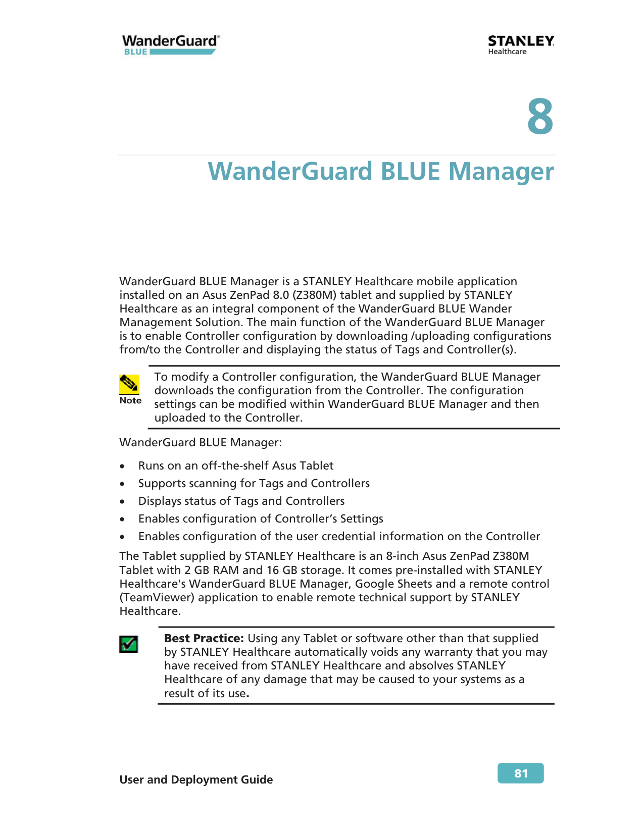 81 8 WanderGuard BLUE Manager WanderGuard BLUE Manager is a STANLEY Healthcare mobile application installed on an Asus ZenPad 8.0 (Z380M) tablet and supplied by STANLEY Healthcare as an integral component of the WanderGuard BLUE Wander Management Solution. The main function of the WanderGuard BLUE Manager is to enable Controller configuration by downloading /uploading configurations from/to the Controller and displaying the status of Tags and Controller(s).