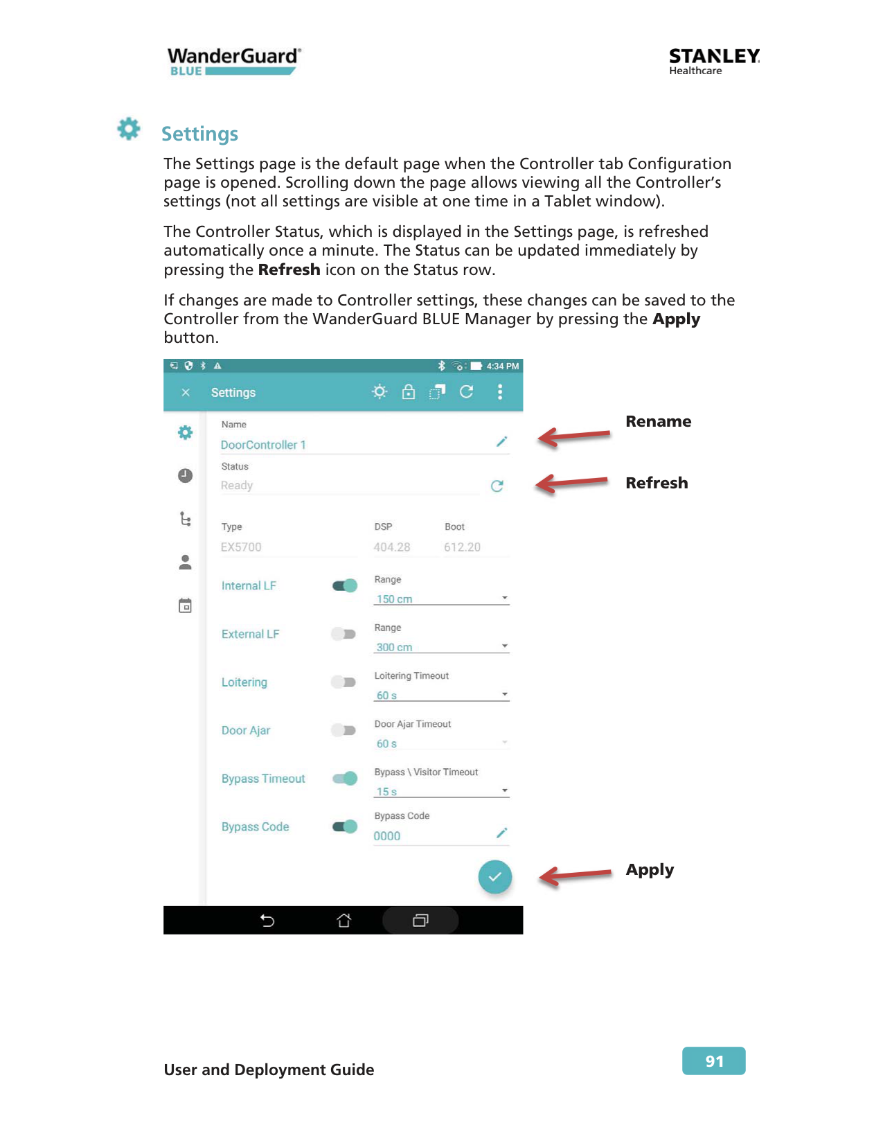 Settings The Settings page is the default page when the Controller tab Configuration page is opened. Scrolling down the page allows viewing all the Controller’s settings (not all settings are visible at one time in a Tablet window). The Controller Status, which is displayed in the Settings page, is refreshed automatically once a minute. The Status can be updated immediately by pressing the Refresh icon on the Status row. If changes are made to Controller settings, these changes can be saved to the Controller from the WanderGuard BLUE Manager by pressing the Apply button.