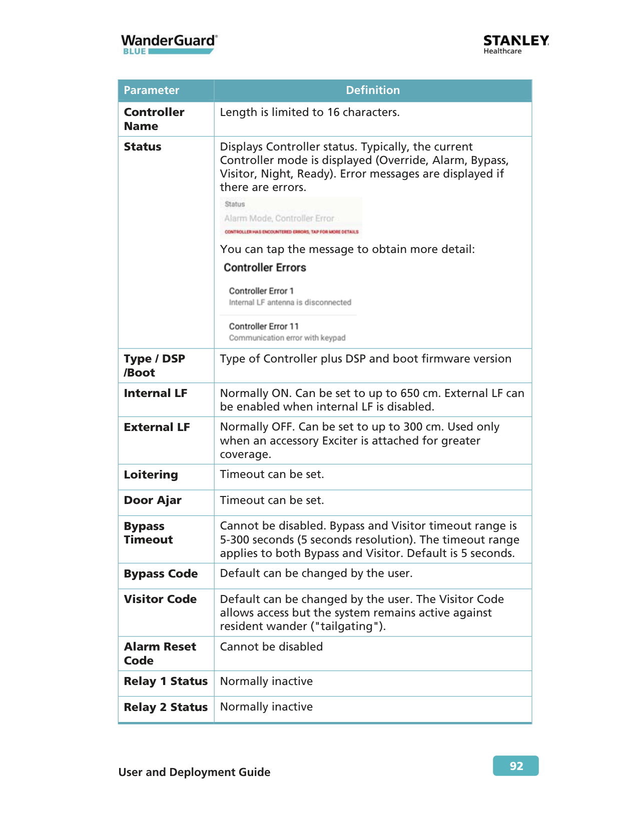 92 Parameter Definition Controller Name Length is limited to 16 characters. Status Displays Controller status. Typically, the current Controller mode is displayed (Override, Alarm, Bypass, Visitor, Night, Ready). Error messages are displayed if there are errors.