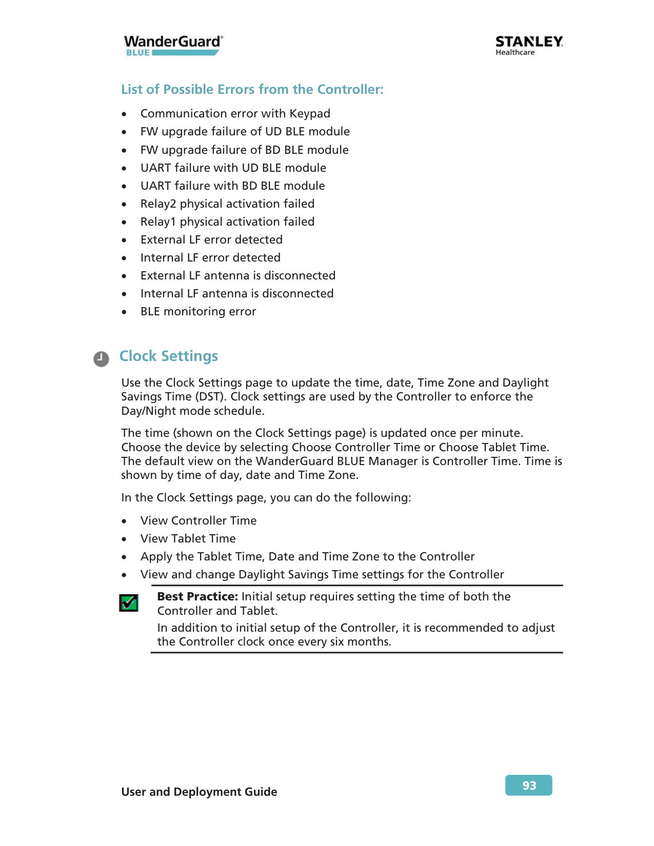 Best Practice: Initial setup requires setting the time of both the Controller and Tablet. In addition to initial setup of the Controller, it is recommended to adjust the Controller clock once every six months.
