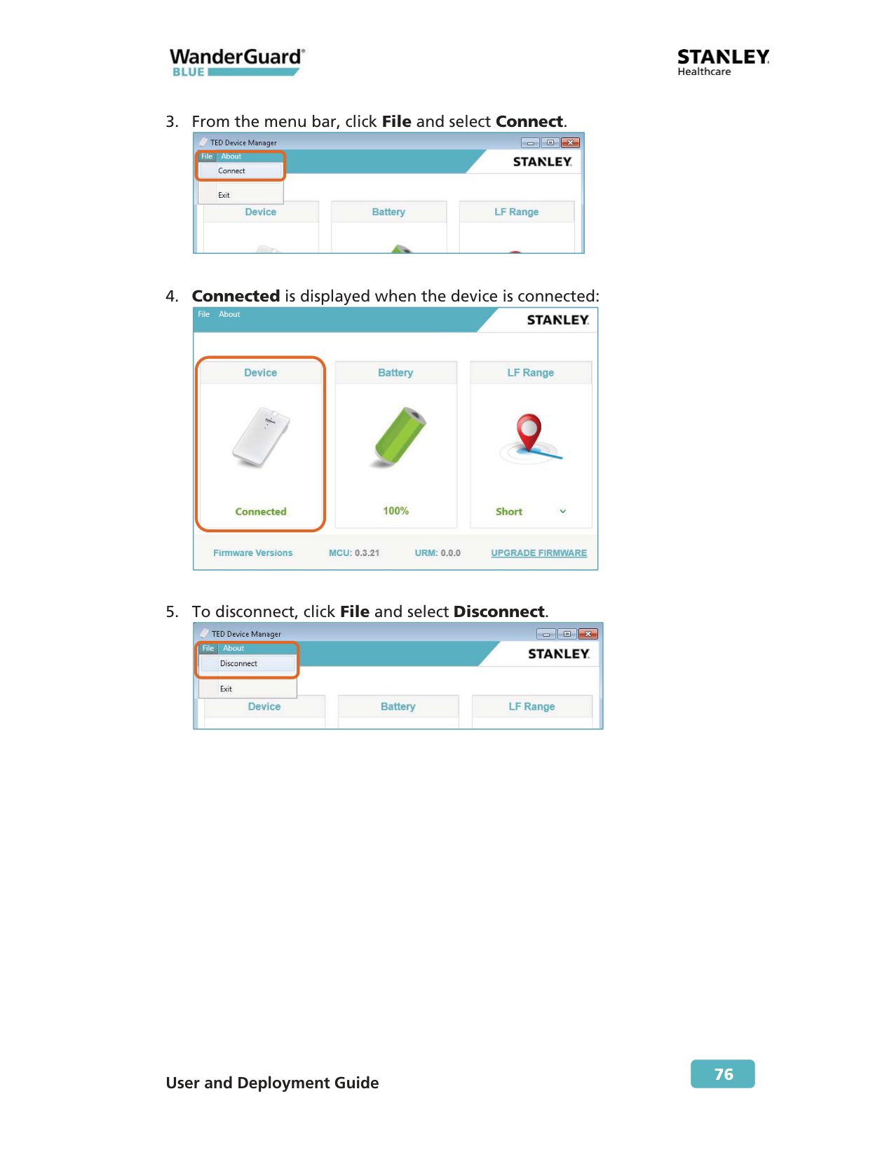 First, make sure the device is connected to the PC using the USB cable. From the Hardware Manager application, click TED Device Manager, then click File and select Connect. The application will display 'Connected' when the device is successfully connected.