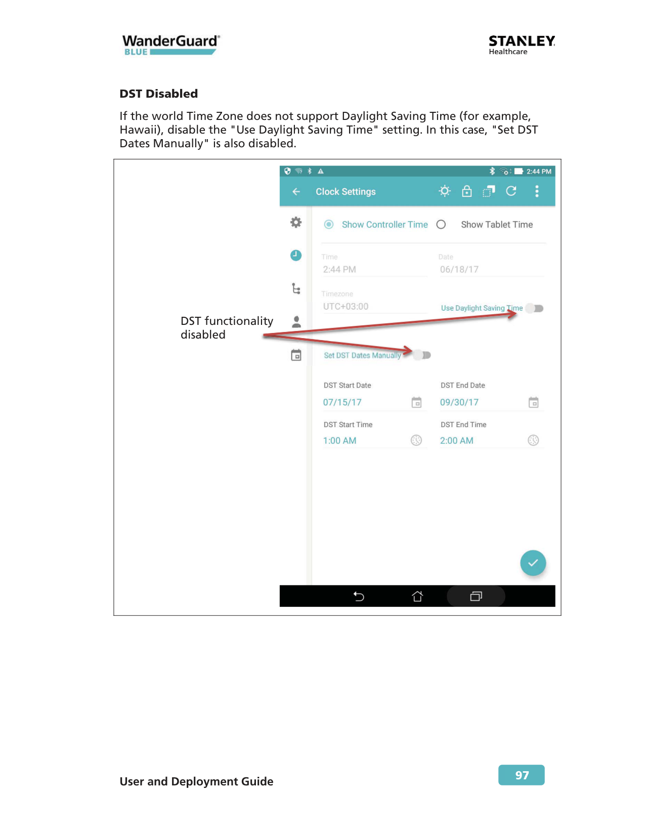 97 DST Disabled If the world Time Zone does not support Daylight Saving Time (for example, Hawaii), disable the "Use Daylight Saving Time" setting. In this case, "Set DST Dates Manually" is also disabled.