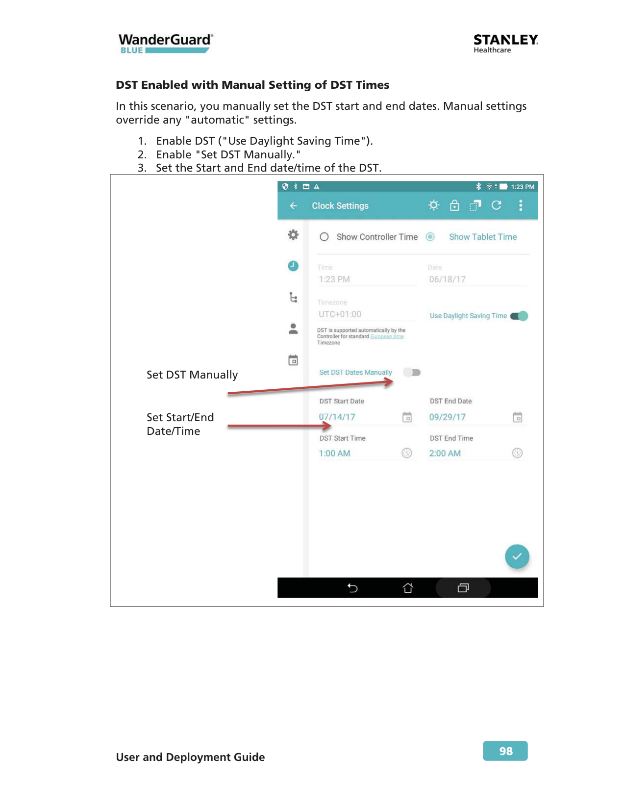 98 DST Enabled with Manual Setting of DST Times In this scenario, you manually set the DST start and end dates. Manual settings override any "automatic" settings.