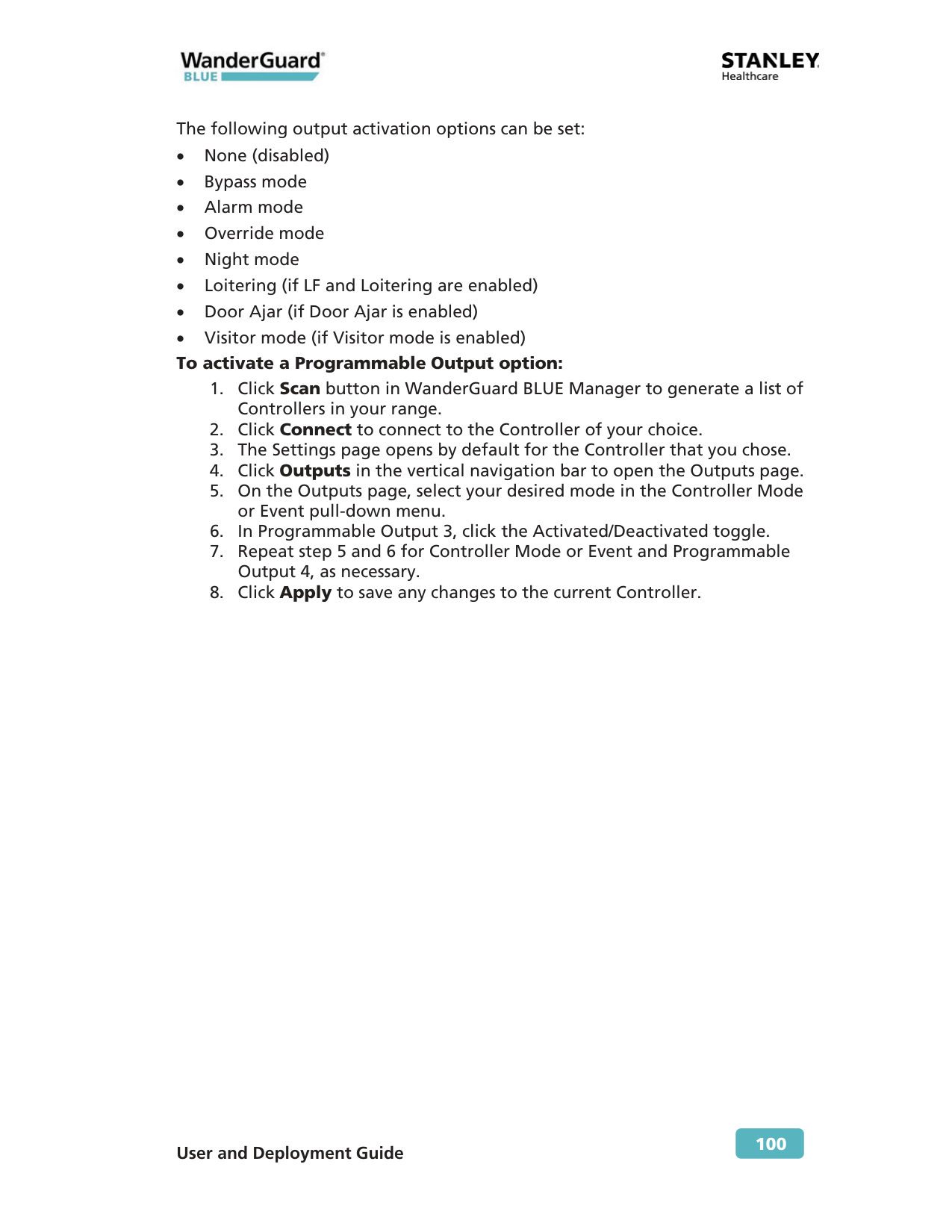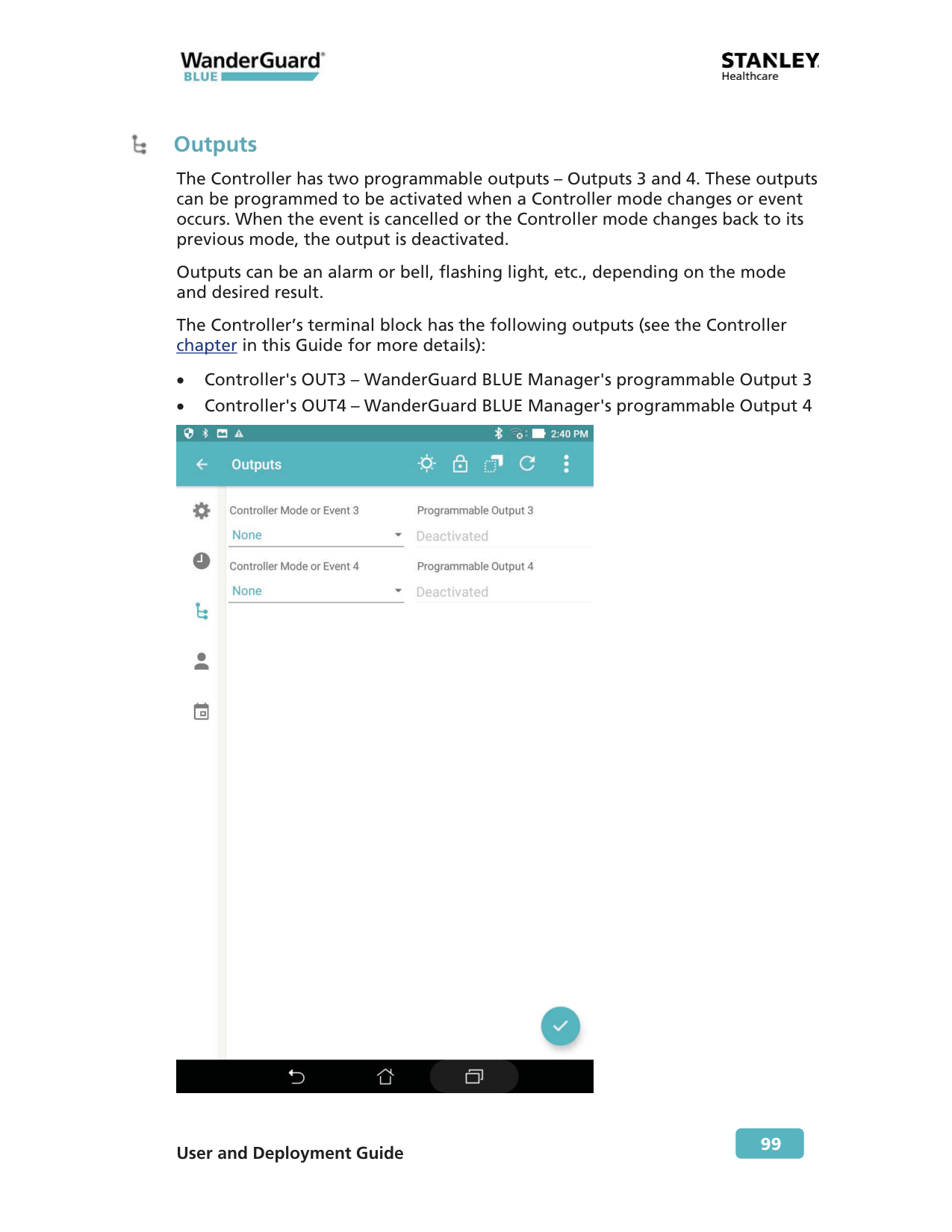 Outputs The Controller has two programmable outputs – Outputs 3 and 4. These outputs can be programmed to be activated when a Controller mode changes or event occurs. When the event is cancelled or the Controller mode changes back to its previous mode, the output is deactivated. Outputs can be an alarm or bell, flashing light, etc., depending on the mode and desired result. The Controller’s terminal block has the following outputs (see the Controller chapter in this Guide for more details): x Controller's OUT3 – WanderGuard BLUE Manager's programmable Output 3 x Controller's OUT4 – WanderGuard BLUE Manager's programmable Output 4