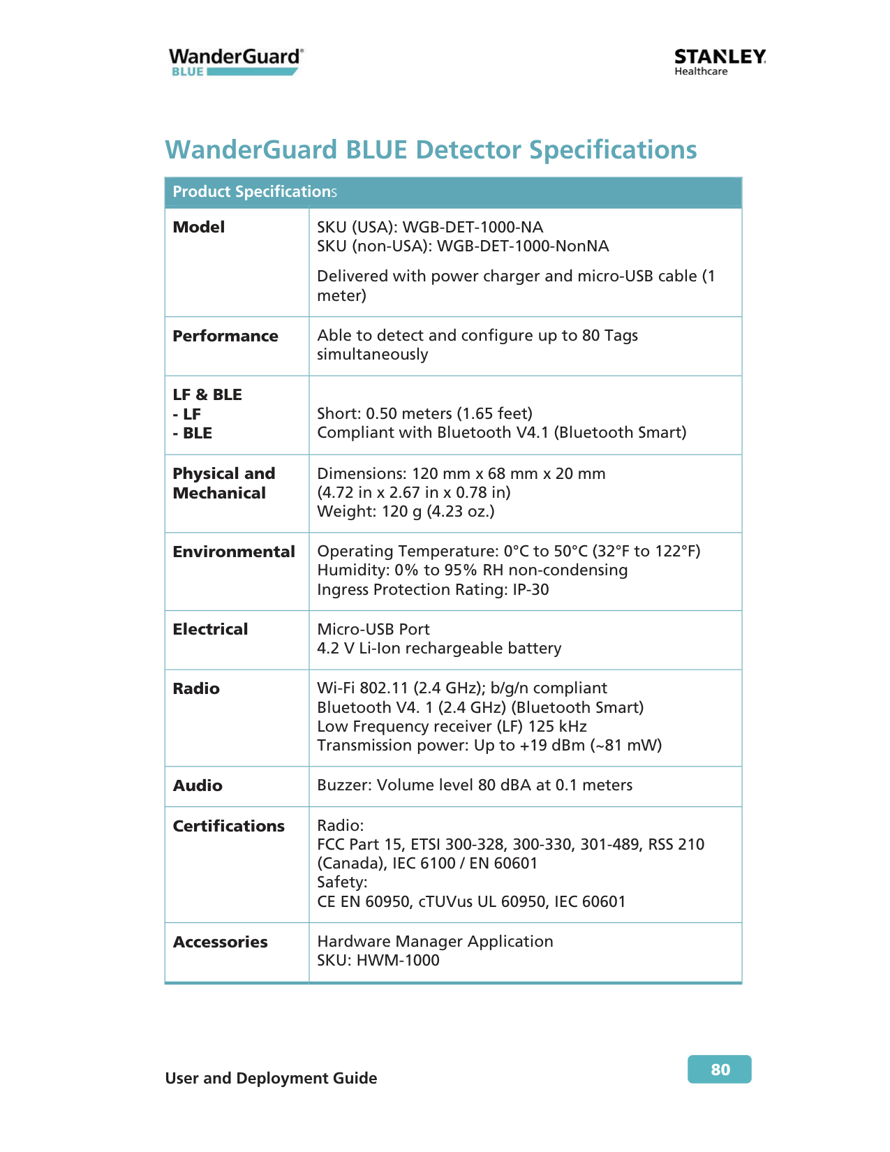 80 WanderGuard BLUE Detector Specifications Product Specifications Model