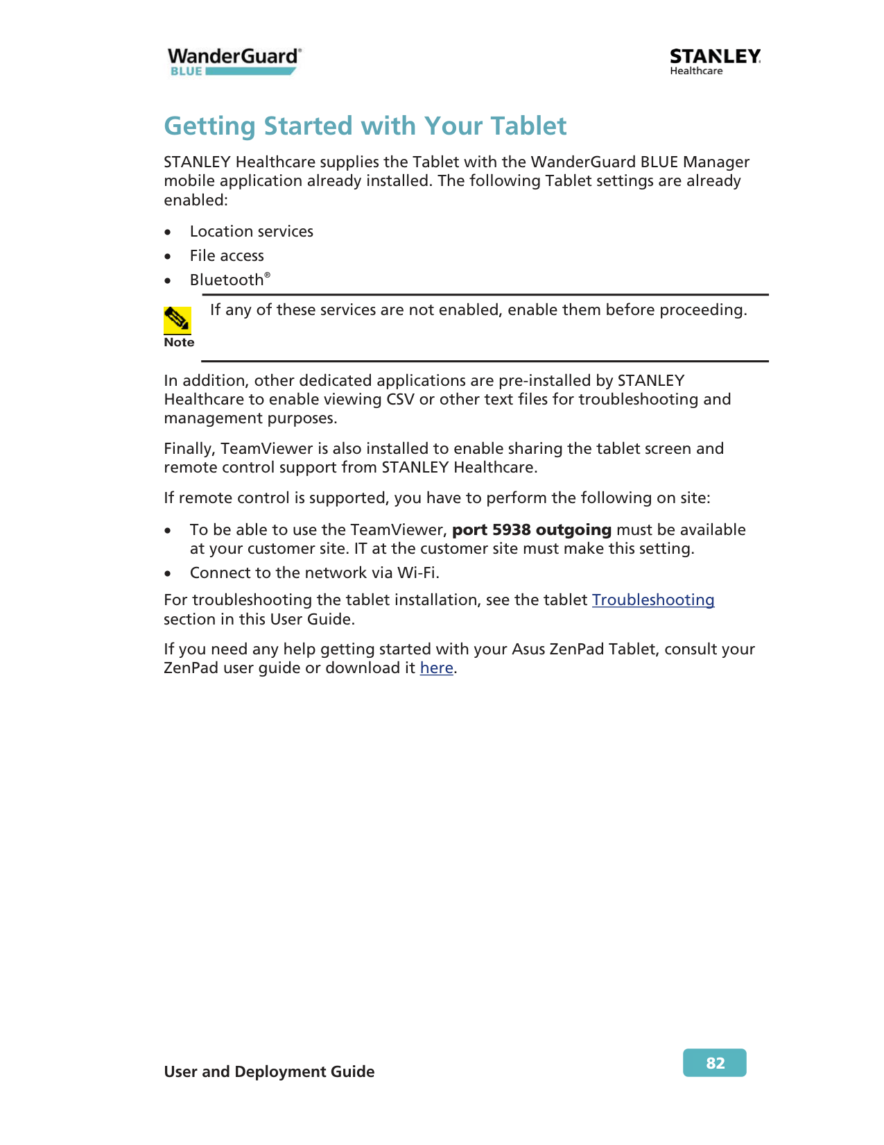 Note If any of these services are not enabled, enable them before proceeding. In addition, other dedicated applications are pre-installed by STANLEY Healthcare to enable viewing CSV or other text files for troubleshooting and management purposes. Finally, TeamViewer is also installed to enable sharing the tablet screen and remote control support from STANLEY Healthcare. If remote control is supported, you have to perform the following on site: x To be able to use the TeamViewer, port 5938 outgoing must be available at your customer site. IT at the customer site must make this setting. x Connect to the network via Wi-Fi. For troubleshooting the tablet installation, see the tablet Troubleshooting section in this User Guide. If you need any help getting started with your Asus ZenPad Tablet, consult your ZenPad user guide or download it here.