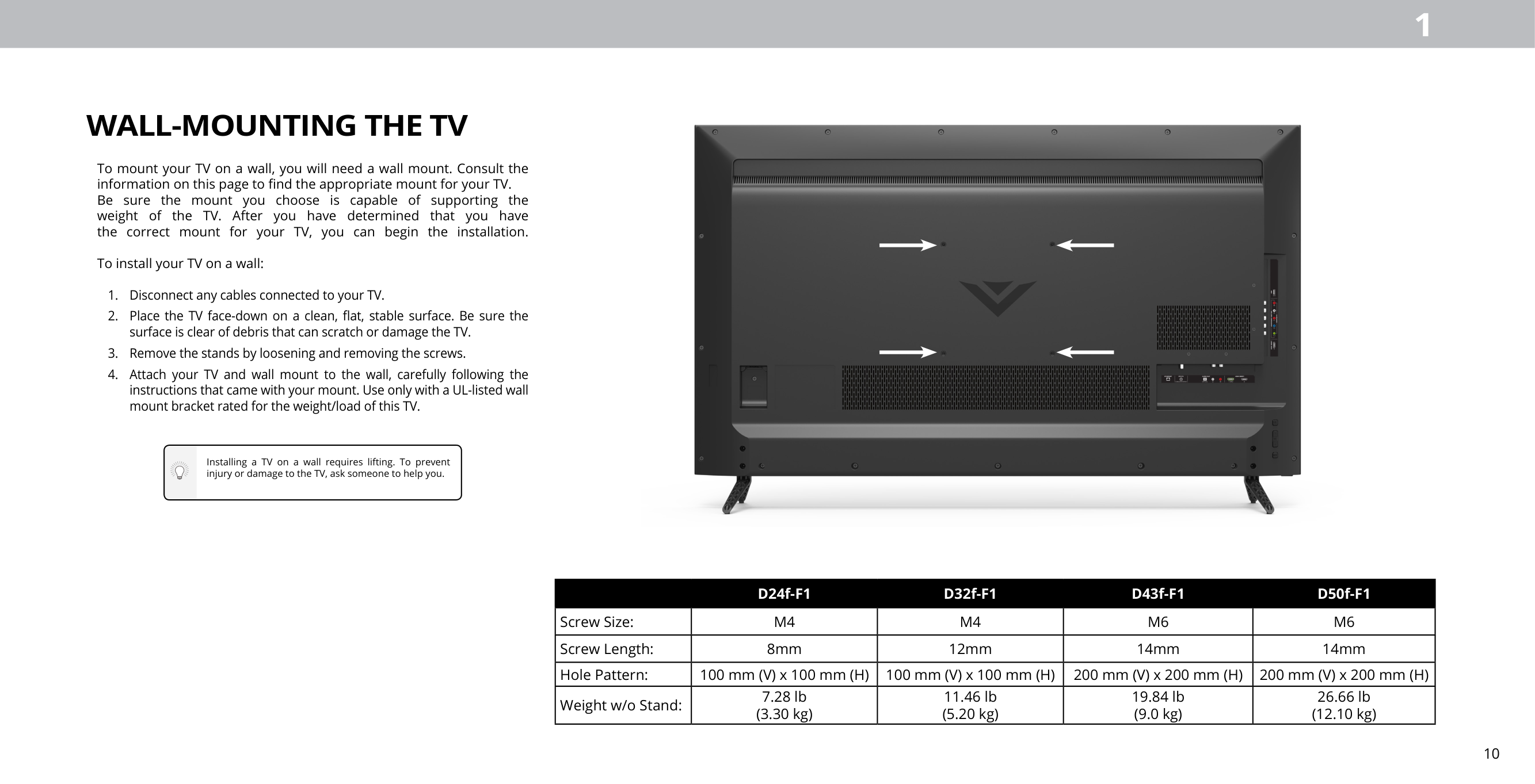 Installing a TV on a wall requires lifting. To prevent injury or damage to the TV, ask someone to help you. D24f-F1 D32f-F1 D43f-F1 D50f-F1 Screw Size:M4
