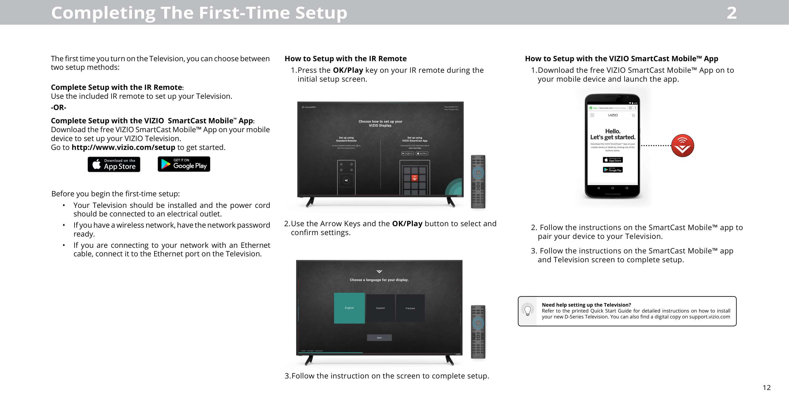 Complete Setup with the VIZIO SmartCast Mobile™ App: Download the free VIZIO SmartCast Mobile™ App on your mobile device to set up your VIZIO Television. Go to http://www.vizio.com/setup to get started. Completing The First-Time Setup The first time you turn on the Television, you can choose between two setup methods: How to Setup with the VIZIO SmartCast Mobile™ App3 Using the On-Screen Menu Your TV features an easy-to-use on-screen menu. To open the on-screen menu, press the Menu button on the remote. From this menu, you can: • Adjust the Picture settings • Adjust the Audio settings • Adjust the Network settings • Set up the Timers • Adjust the Channel settings • Set up Closed Captioning • Name and adjust Inputs • Adjust TV settings • View user manual
