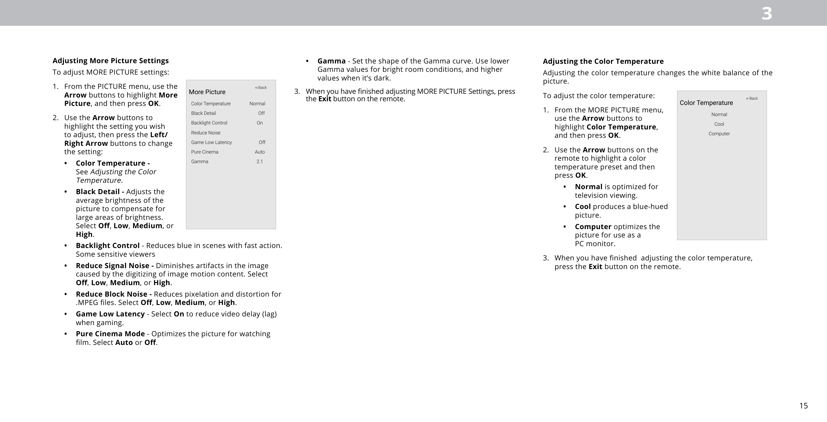 Your TV display can be adjusted to suit your preferences and viewing conditions. If you’ve made changes to the Settings for a picture mode, an asterisk appears after its name (see Saving a Custom Picture Mode). To adjust the picture settings:3 Adjusting More Picture Settings To adjust MORE PICTURE settings: