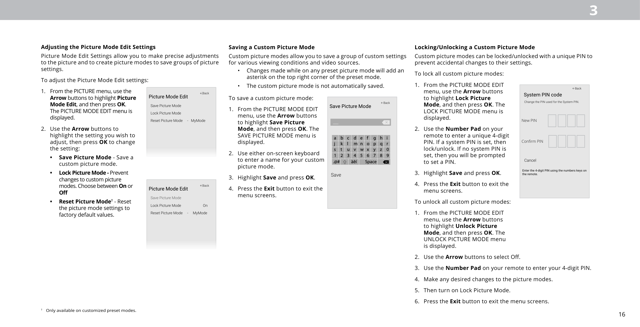 3 † Only available on customized preset modes. Locking/Unlocking a Custom Picture Mode Custom picture modes can be locked/unlocked with a unique PIN to prevent accidental changes to their settings. To lock all custom picture modes: