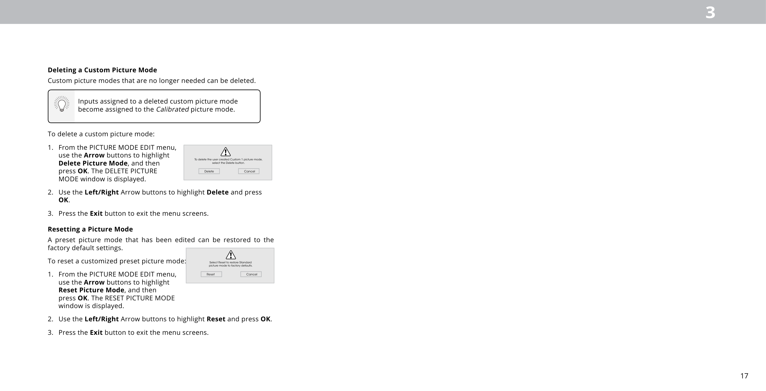 3 Deleting a Custom Picture Mode Custom picture modes that are no longer needed can be deleted. Inputs assigned to a deleted custom picture mode become assigned to the Calibrated picture mode. To delete a custom picture mode: