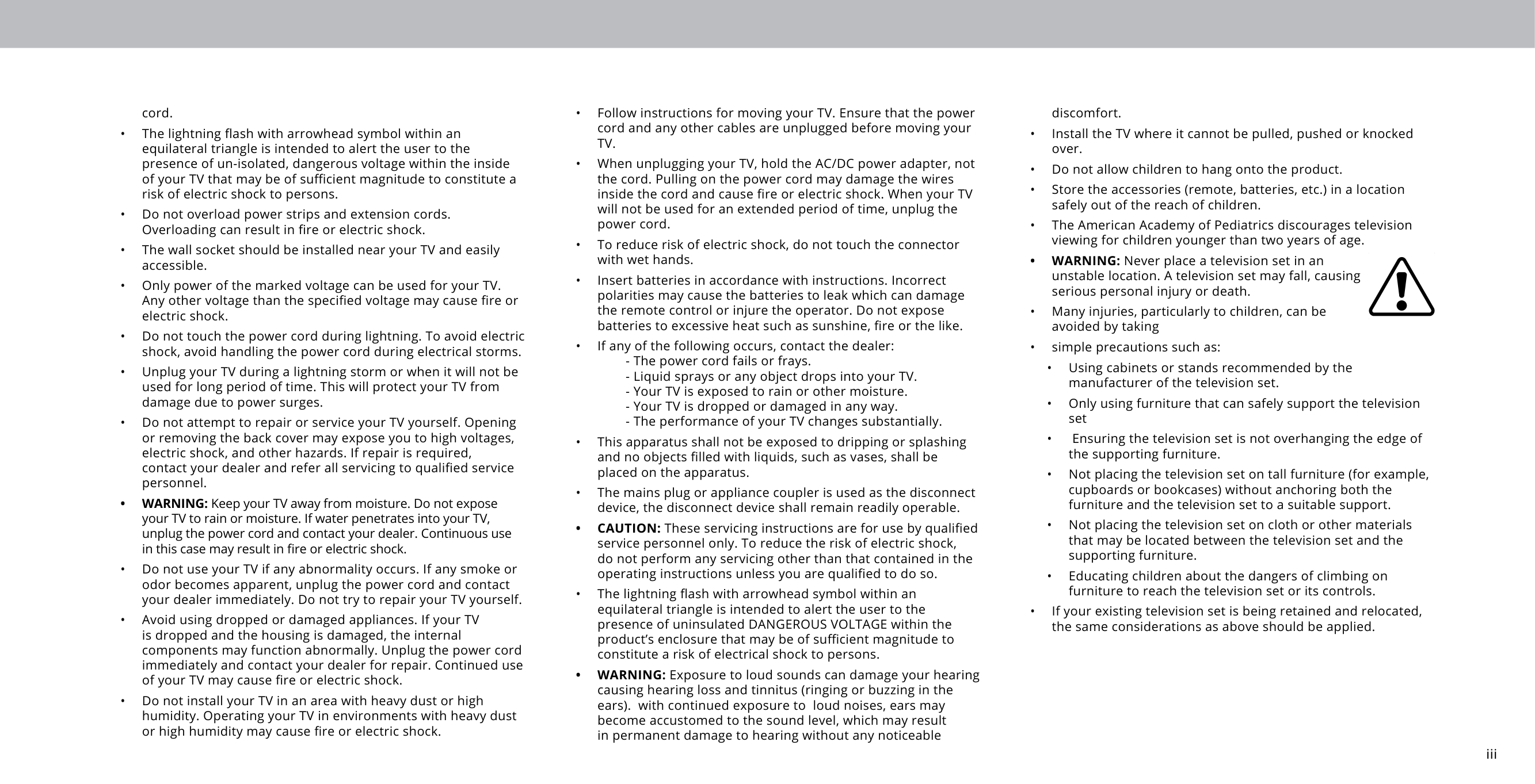 Your TV is designed and manufactured to operate within defined design limits. Misuse may result in electric shock or fire. To prevent your TV from being damaged, the following instructions should be observed for the installation, use, and maintenance of your TV. Read the following safety instructions before operating your TV. Keep these instructions in a safe place for future reference. • To reduce the risk of electric shock or component damage, switch off the power before connecting other components to your TV. • Read these instructions. • Keep these instructions. • Heed all warnings. • Follow all instructions. • Do not use this apparatus near water. • Clean only with dry cloth. • Do not block any ventilation openings. Install in accordance with the manufacturer’s instructions. • Do not install near any heat sources such as radiators, heat registers, stoves, or other apparatus (including amplifiers) that produce heat. • Do not defeat the safety purpose of the polarized or grounding-type plug. A polarized plug has two blades with one wider than the other. A grounding type plug has two blades and a third grounding prong. The wide blade or the third prong are provided for your safety. If the provided plug does not fit into your outlet, consult an electrician for replacement of the obsolete outlet. • Protect the power cord from being walked on or pinched particularly at plugs, convenience receptacles, and the point where they exit from the apparatus. • Only use attachments/accessories specified by the manufacturer. • Use only with the cart, stand, tripod, bracket, or table specified by the manufacturer, or sold with the apparatus. When a cart is used, use caution when moving the cart/ apparatus combination to avoid injury from tip-over. • Unplug this apparatus during lightning storms or when unused for long periods of time. • Refer all servicing to qualified service personnel. Servicing is required when the apparatus has been damaged in any way, such as the power-supply cord or plug is damaged, liquid has been spilled or objects have fallen into the apparatus, the apparatus has been exposed to rain or moisture, does not operate normally, or has been dropped. • Unplug the power cord before cleaning your TV. • When moving your TV from an area of low temperature to an area of high temperature, condensation may form in the housing. Wait before turning on your TV to avoid causing fire, electric shock, or component damage. • A distance of at least three feet should be maintained between your TV and any heat source, such as a radiator, heater, oven, amplifier etc. Do not install your TV close to smoke. Operating your TV close to smoke or moisture may cause fire or electric shock. • Slots and openings in the back and bottom of the cabinet are provided for ventilation. To ensure reliable operation of your TV and to protect it from overheating, be sure these openings are not blocked or covered. Do not place your TV in a bookcase or cabinet unless proper ventilation is provided. • Never push any object into the slots and openings on your TV cabinet. Do not place any objects on the top of your TV. Doing so could short circuit parts causing a fire or electric shock. Never spill liquids on your TV. • Your TV should be operated only from the type of power source indicated on the label. If you are not sure of the type of power supplied to your home, consult your dealer or local power company. • Do not apply pressure or throw objects at your TV. This may compromise the integrity of the TV. The manufacturer’s warranty does not cover user abuse or improper installations. • The power cord must be replaced when using different voltage than the voltage specified. For more information, contact your dealer. • When connected to a power outlet, power is always flowing into your TV. To totally disconnect power, unplug the power When you see this symbol, please read the accompanying helpful tip.iii cord. • The lightning flash with arrowhead symbol within an equilateral triangle is intended to alert the user to the presence of un-isolated, dangerous voltage within the inside of your TV that may be of sufficient magnitude to constitute a risk of electric shock to persons. • Do not overload power strips and extension cords. Overloading can result in fire or electric shock. • The wall socket should be installed near your TV and easily accessible. • Only power of the marked voltage can be used for your TV. Any other voltage than the specified voltage may cause fire or electric shock. • Do not touch the power cord during lightning. To avoid electric shock, avoid handling the power cord during electrical storms. • Unplug your TV during a lightning storm or when it will not be used for long period of time. This will protect your TV from damage due to power surges. • Do not attempt to repair or service your TV yourself. Opening or removing the back cover may expose you to high voltages, electric shock, and other hazards. If repair is required, contact your dealer and refer all servicing to qualified service personnel. • WARNING: Keep your TV away from moisture. Do not expose your TV to rain or moisture. If water penetrates into your TV, unplug the power cord and contact your dealer. Continuous use in this case may result in fire or electric shock. • Do not use your TV if any abnormality occurs. If any smoke or odor becomes apparent, unplug the power cord and contact your dealer immediately. Do not try to repair your TV yourself. • Avoid using dropped or damaged appliances. If your TV is dropped and the housing is damaged, the internal components may function abnormally. Unplug the power cord immediately and contact your dealer for repair. Continued use of your TV may cause fire or electric shock. • Do not install your TV in an area with heavy dust or high humidity. Operating your TV in environments with heavy dust or high humidity may cause fire or elect