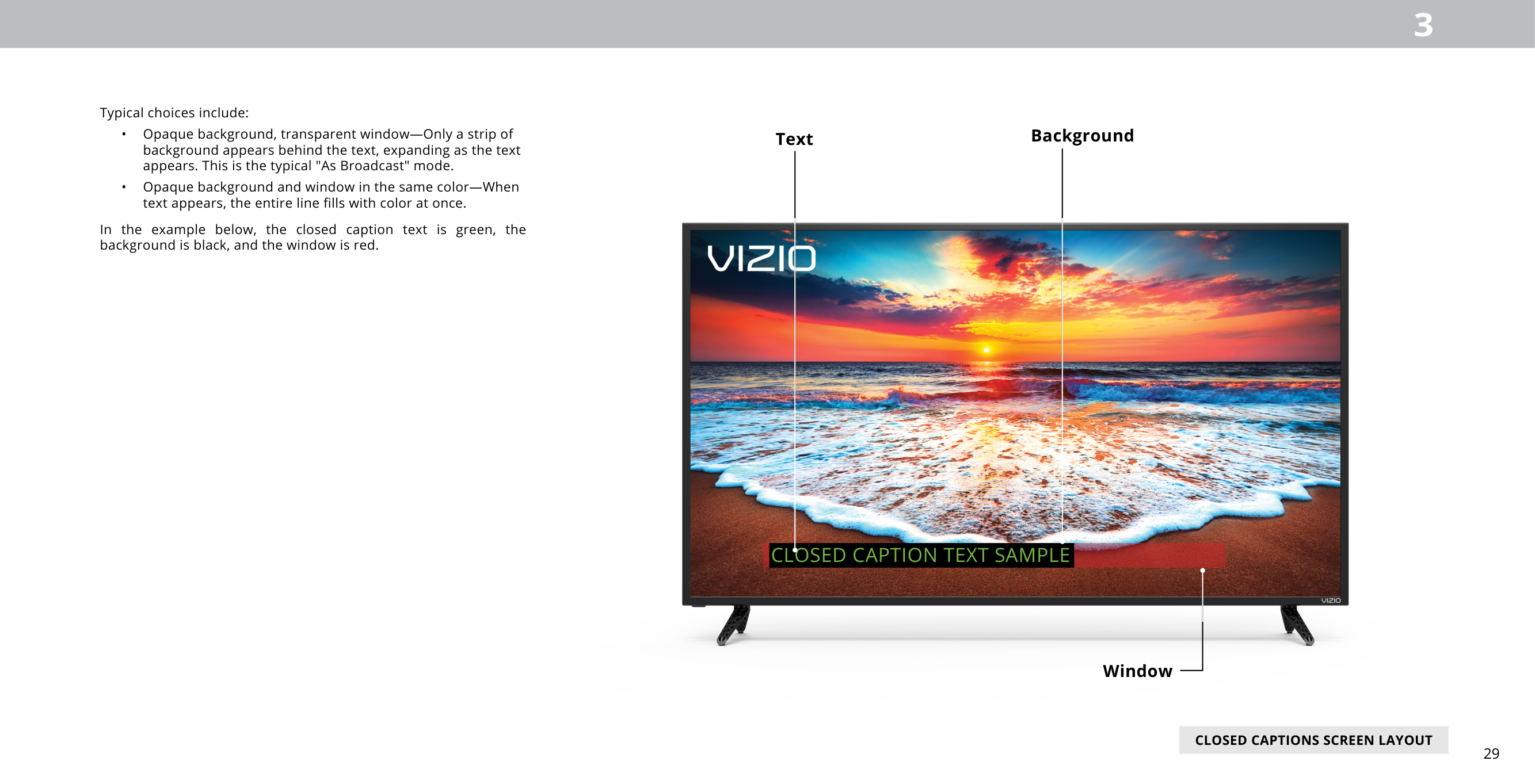 3 Typical choices include: • Opaque background, transparent window—Only a strip of background appears behind the text, expanding as the text appears. This is the typical "As Broadcast" mode. • Opaque background and window in the same color—When text appears, the entire line fills with color at once. In the example below, the closed caption text is green, the background is black, and the window is red.