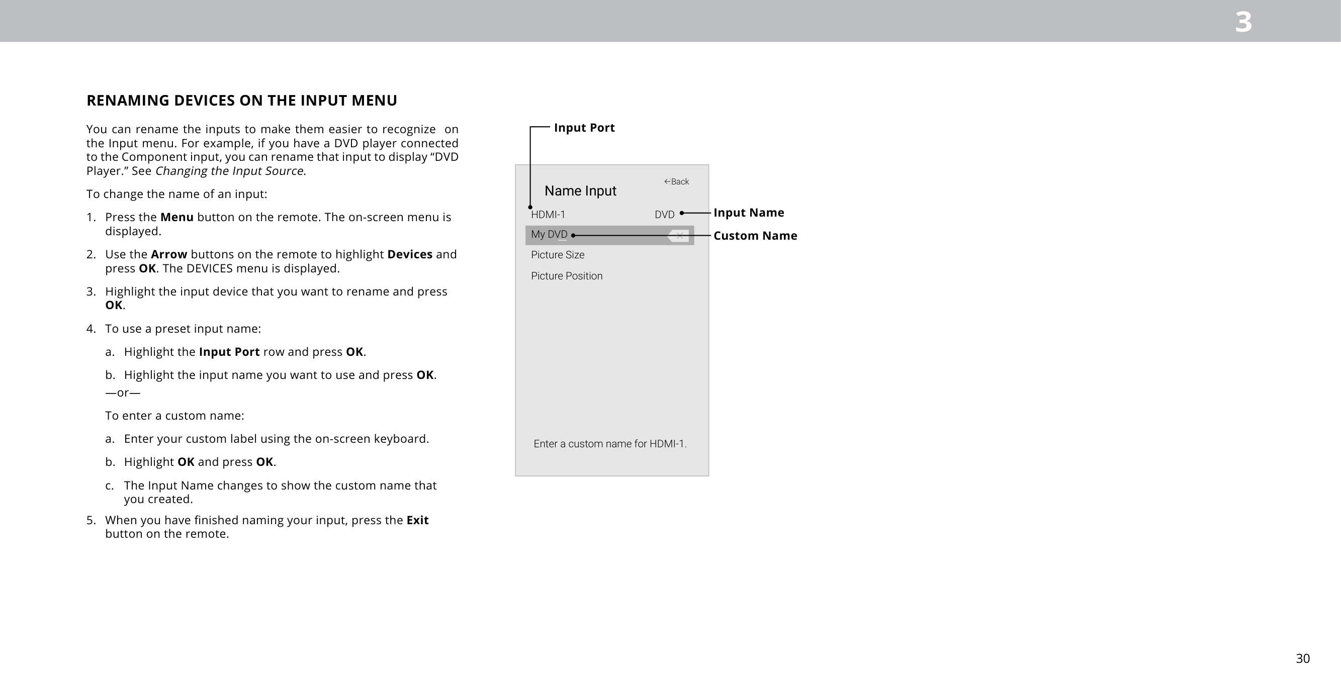 You can rename the inputs to make them easier to recognize on the Input menu. For example, if you have a DVD player connected to the Component input, you can rename that input to display “DVD Player.” See Changing the Input Source. To change the name of an input:Ok.