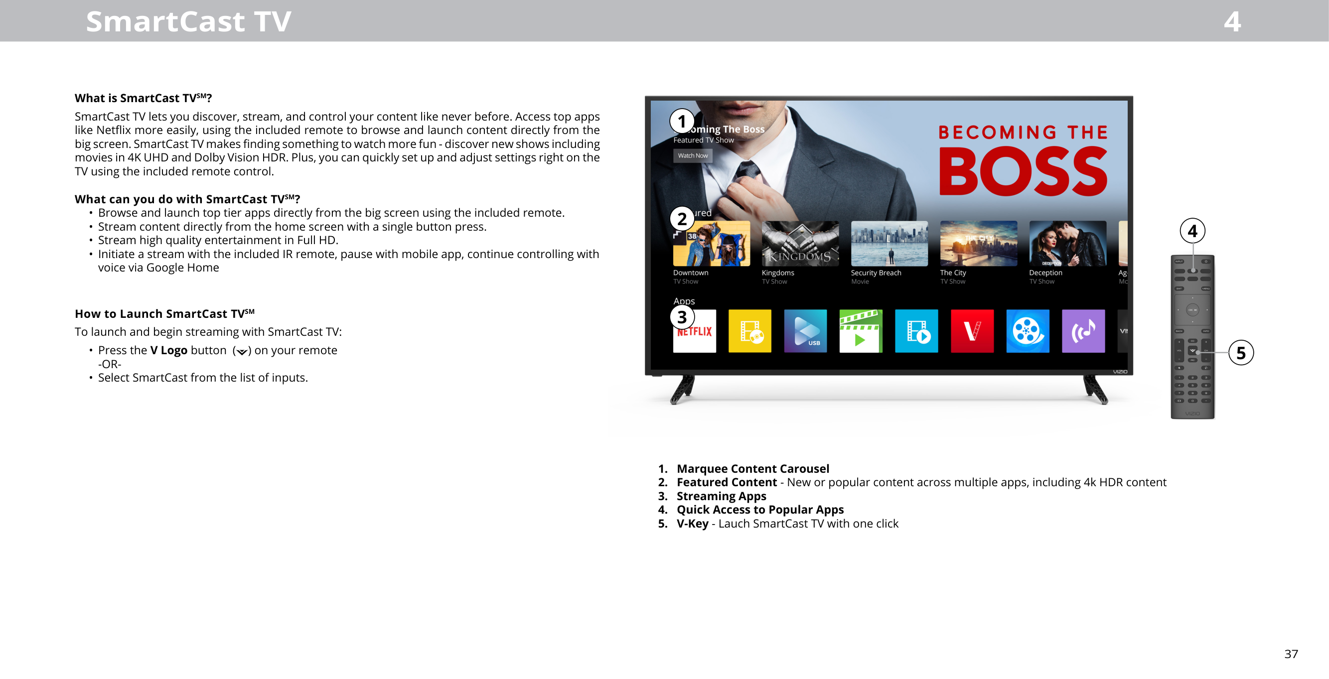 To open the on-screen menu, press the Menu button on the remote. Use the Arrow buttons to highlight a menu option, and press the OK button to select that option. While navigating the on-screen menu, you can press the Back button at any time to return to the previous menu screen. The Exit button will close the on- screen menu.Smartcast