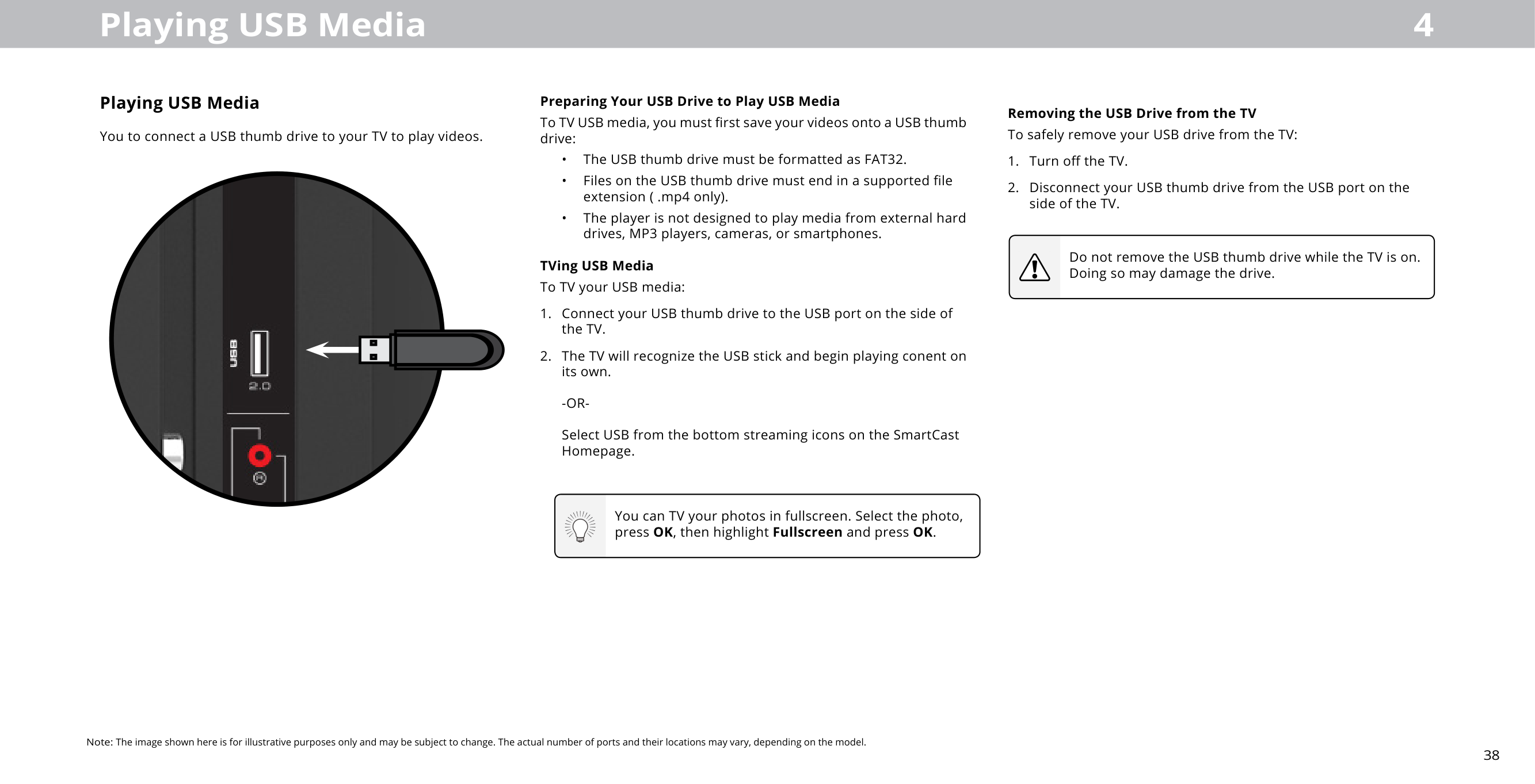 USB - Connect a USB thumb drive to play photo, music, or video.9 1 Components - Connect a component or composite devices. USB - Connect a USB thumb drive to play photo, music, or video. HDMI - Connect an HDMI device. HDMI - Connect an HDMI device. RCA Audio Out- Connect an RCA audio device, such as sound bar. Optical Audio Out - Connect an optical/SPDIF audio device, such as home audio receiver. Power - Press to turn on the TV. Press and hold to turn the TV off. Input - Press to access the input menu. Note: The image shown here is for illustrative purposes only and may be subject to change. The actual number of ports and their locations may vary, depending on the model. Volume - Press to increase or decrease the TV volume level. Ethernet - Connect an Ethernet cable to modem/ router. Coaxial - Connect a coaxial cable from cable, satellite, or antenna.
