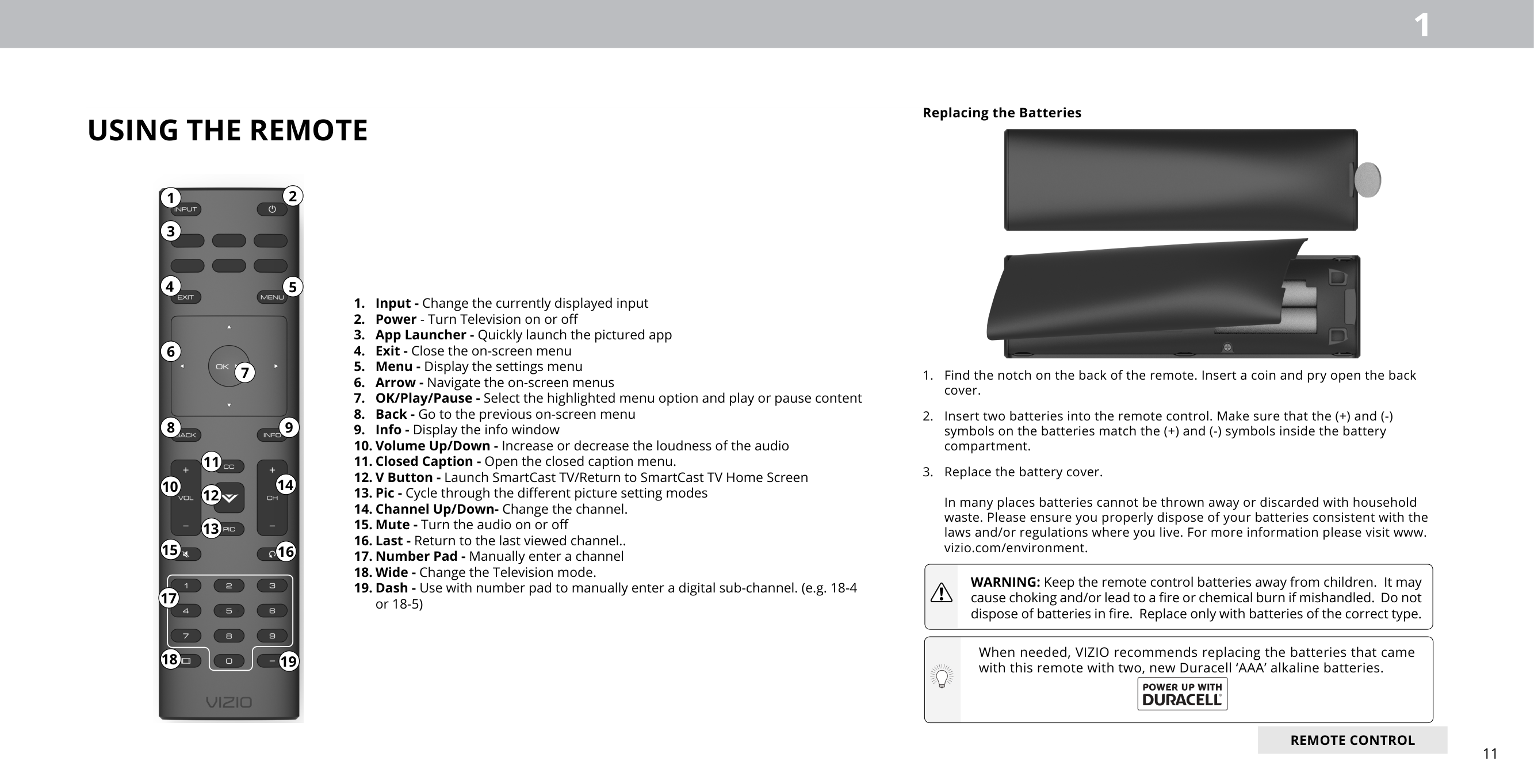 In many places batteries cannot be thrown away or discarded with household waste. Please ensure you properly dispose of your batteries consistent with the laws and/or regulations where you live. For more information please visit www. vizio.com/environment. WARNING: Keep the remote control batteries away from children. It may cause choking and/or lead to a fire or chemical burn if mishandled. Do not dispose of batteries in fire. Replace only with batteries of the correct type. When needed, VIZIO recommends replacing the batteries that came with this remote with two, new Duracell ‘AAA’ alkaline batteries. 1