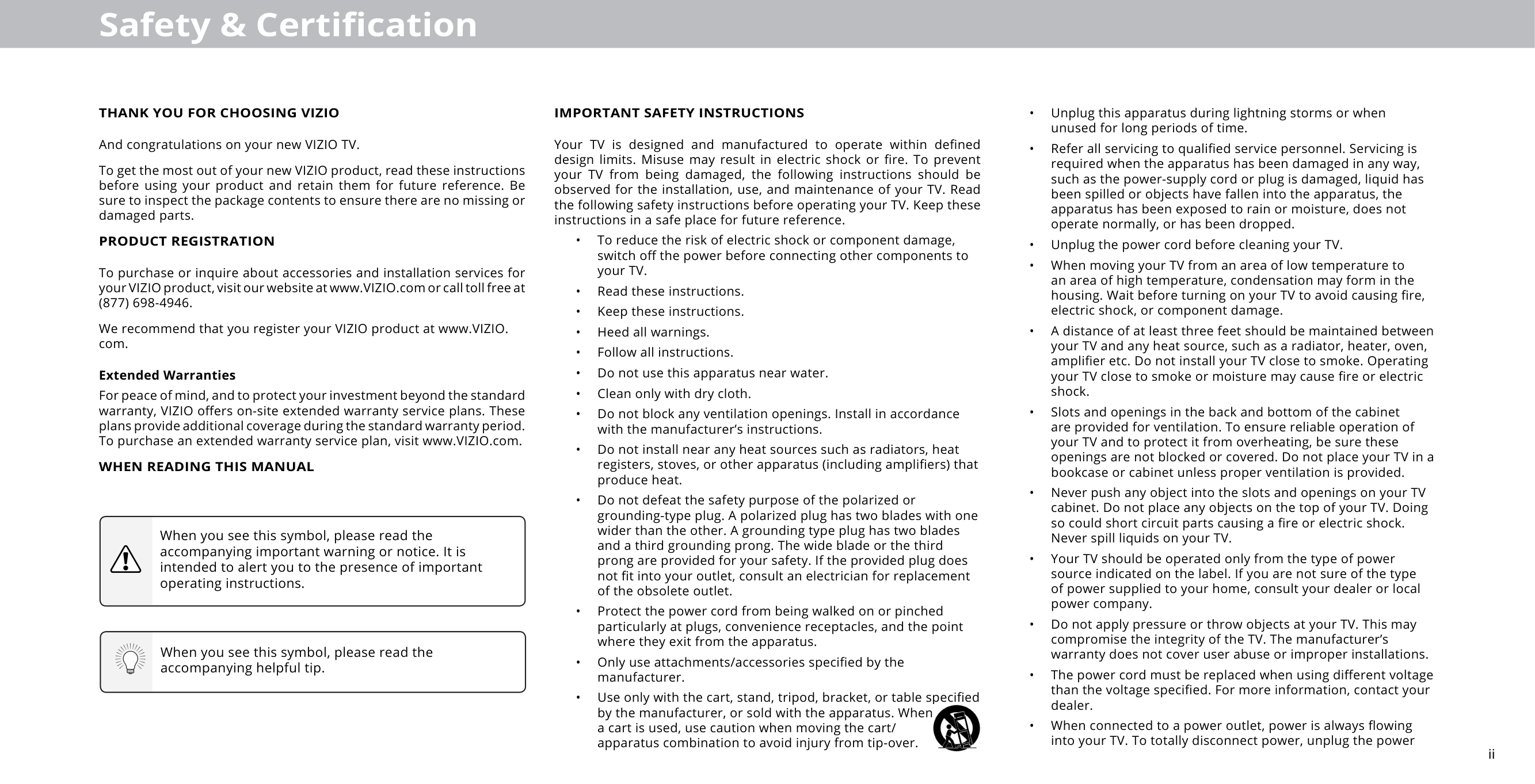And congratulations on your new VIZIO TV. To get the most out of your new VIZIO product, read these instructions before using your product and retain them for future reference. Be sure to inspect the package contents to ensure there are no missing or damaged parts.Product Registration