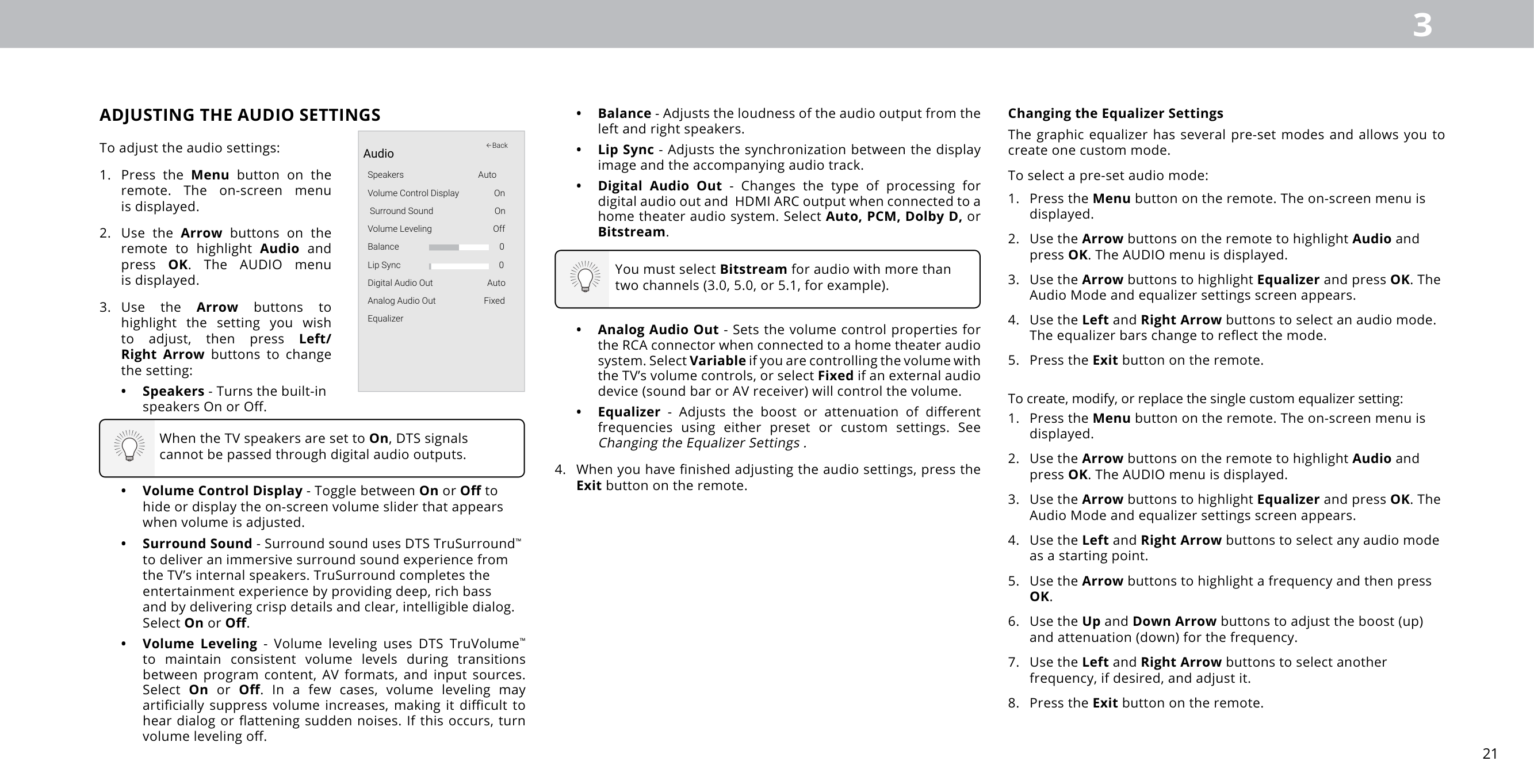 3 Changing the Equalizer Settings The graphic equalizer has several pre-set modes and allows you to create one custom mode. To select a pre-set audio mode: