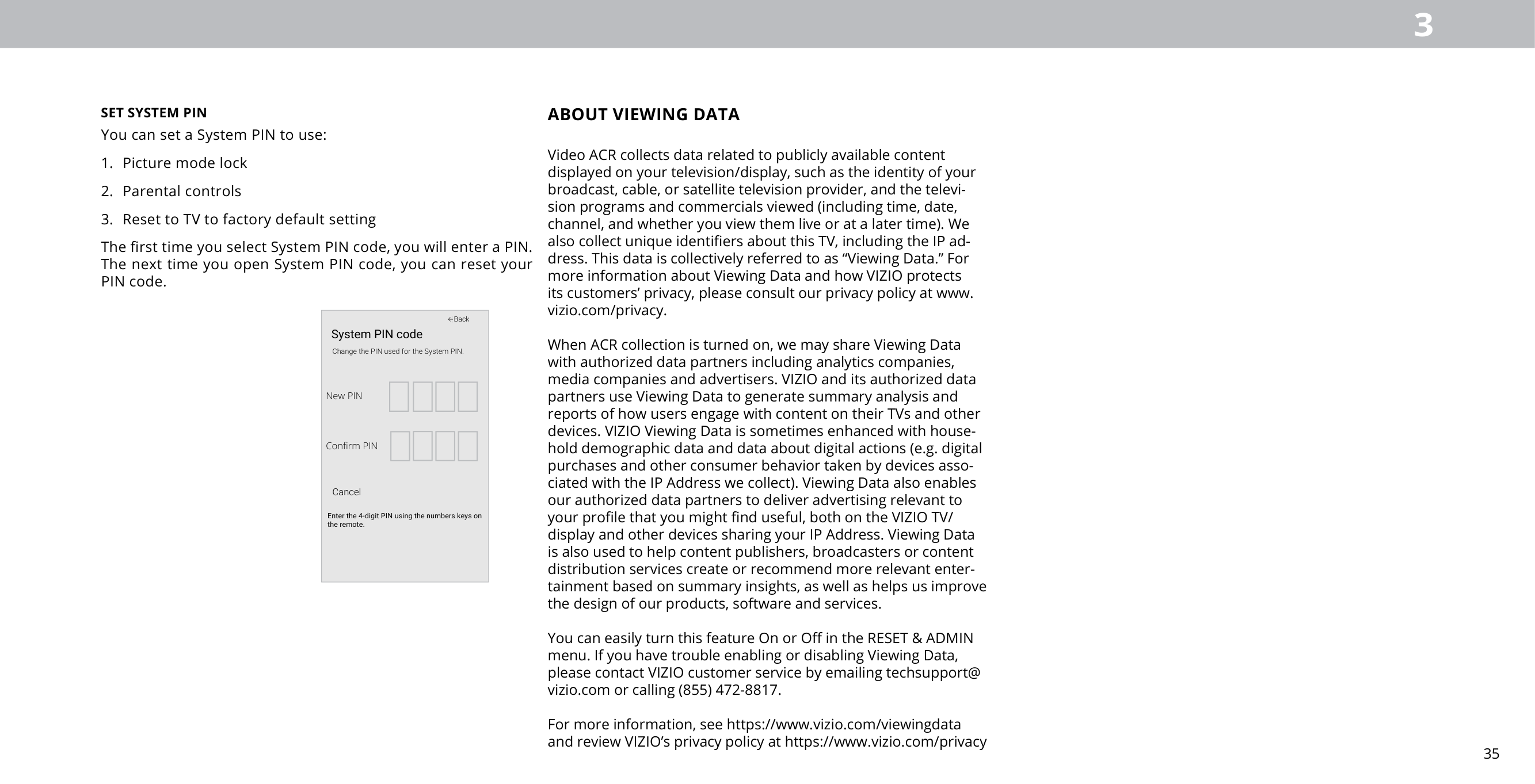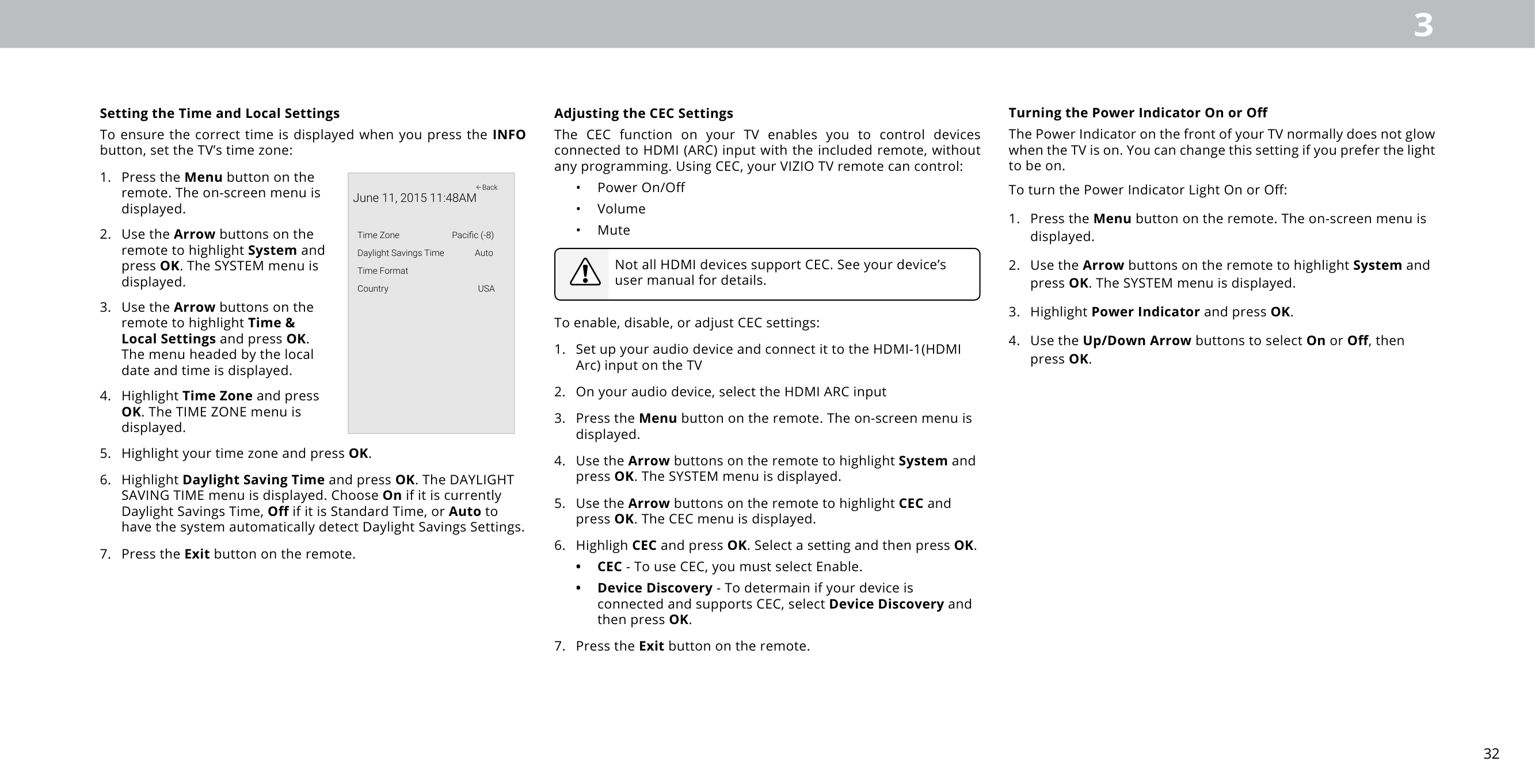 Legal Information Software Licenses All software is provided subject to a software license agreement(s) and you agree that you will be bound by such license agreement(s) in addition to these terms. Your use of this product is subject to VIZIO’s privacy policy, which may be updated from time to time, and is available to view at http://www.vizio.com/privacy. Export Regulations Customer acknowledges that the VIZIO products, which include technology and software, are subject to customs and export control laws in the United States (“US”). The products may also be subject to the customs and export control laws and regulations of the country in which the products are manufactured and/or received. Internet Connectivity Network conditions, environmental and other factors may negatively affect connectivity and the resulting video quality, if any. The applications and content of the applications pictured herein or described in accompanying documentation may only be available in certain countries or languages, may require additional fees or subscription charges, and may be subject to future updates, modifications or discontinuation without notice. VIZIO has no control over third party applications or content and assumes no responsibility for the availability or interruption of such applications or content. Additional third party terms, conditions and restrictions apply. A Google account is required to download applications from the Google Play store. A MyVIZIO account is required to access certain features of the VIZIO SmartCast™ App.Information in this User Manual is subject to change without notice. To review the most updated version of this User Manual and the associated Quick Start Guide, go to http://www.vizio.com. © 2017 VIZIO, Inc. All Right Reserved. This User Manual may not be copied in whole or in part without the written permission of VIZIO, Inc. VIZIO, Inc. has made reasonable efforts to ensure the accuracy of the information provided herein. All product specifications, functionality, features, configurations, performance, design and other product information described herein are subject to change without notice. VIZIO, Inc. is not responsible for typographical, technical, or descriptive errors. VIZIO, the VIZIO logo, the V logo, and other terms and phrases are trademarks or registered trademarks of VIZIO, Inc. HDMI, HDMI High-Definition Multimedia Interface, and the HDMI Logo are trademarks or registered trademarks of HDMI Licensing LLC. The Bluetooth® word mark and logos are registered trademarks owned by Bluetooth SIG, Inc. Used under license. For DTS patents, see http://patents.dts.com. Manufactured under license from DTS Licensing Limited. DTS, the Symbol, & DTS and the Symbol together are registered trademarks, and DTS Studio Sound is a trademark of DTS, Inc. © DTS, Inc. All Rights Reserved. Dolby and the double-D symbol are registered trademarks of Dolby Laboratories. © 2017 Google Inc. All rights reserved. Google Cast is a trademark of Google Inc. Other names of companies, products, and services used in this User Manual may be trademarks, trade names or service marks of others and VIZIO, Inc. disclaims any interest in trademarks, trade names or service marks other than its own. Mention of non-VIZIO products is for informational purposes only. Caution: Avoid exposing a drive to magnetic fields. Security devices with magnetic fields may include airport walk- through devices and security wands. Airport conveyor belts or similar security devices that check carry-on luggage generally use X-rays and should not cause magnetic damage to drives. If you are traveling internationally, check the customs regulations for device use for each country you will visit, and check the power cord and adapter requirements for each location in which you plan to use the display as voltage, frequency and plug configurations may vary. Warning: To reduce risk of electric shock, fire or damage to your device or other property, do not attempt to power the device with a voltage converter kit sold for appliances. Battery Disposal Caution: This product may be shipped with batteries. Do not dispose of batteries in a fire or with ordinary household waste. Batteries may explode and can cause damage. Replace batteries only with the same or equivalent type of battery recommended by VIZIO. The disposal of batteries may be regulated by your state. Please always check with your state to determine the how to properly dispose of your batteries. Product Recycling The disposal and recycling of consumer electronic products may be regulated by your state. Always properly dispose of your VIZIO products in accordance with local laws and regulations. VIZIO supports the proper recycling of our products. For information on how to properly recycle your VIZIO products and to learn more about consumer electronics recycling laws, please go to www.vizio.com/environment or call (800) 374-3473.
