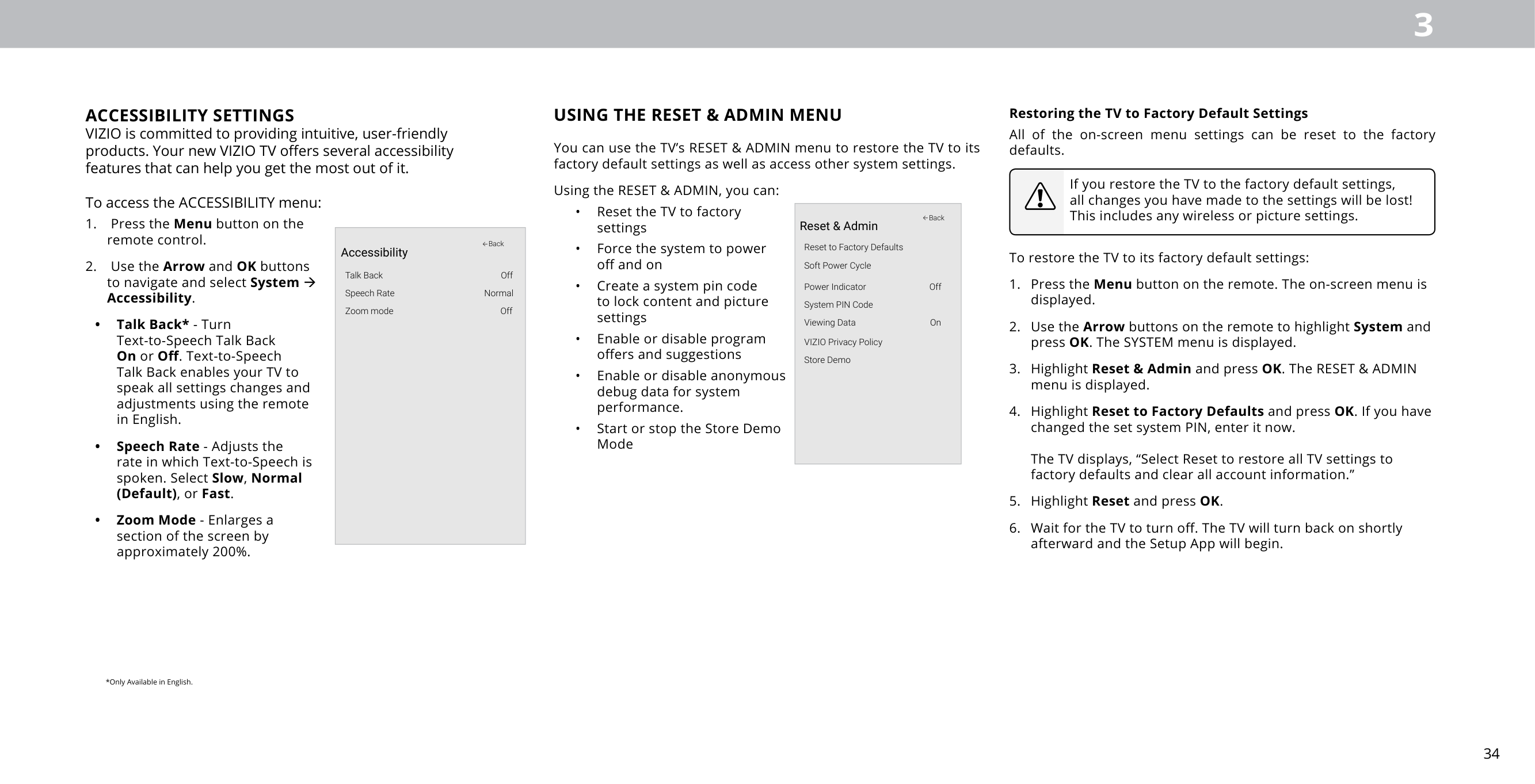 SHIP-IN WARRANTY SERVICE. If this occurs, your product will be restored to its original state. You will be responsible for restoring all applicable user data and downloaded applications. Recovery and reinstallation of user data and downloaded applications is not covered under this warranty. In order to protect your personal information, VIZIO recommends that you always clear all personal information from the product before it is serviced, regardless of the servicer. VIZIO’s Responsibilities If VIZIO determines that a product is covered by this warranty, VIZIO will (at its option) repair or replace it, or refund the purchase price to you. There will be no charge for parts or labor during the warranty period. Replacement parts may be new or recertified at VIZIO’s option and sole discretion. Replacement parts and VIZIO’s labor are warranted for the remaining portion of the original warranty or for ninety (90) days from warranty service, whichever is longer.Types of Service TVs that are 32 inches or larger will usually be serviced in-home. In-home service requires complete and easy access to the product and does not include de-installation or re-installation of the product. In-home service is subject to availability. VIZIO will provide other service options when in- home service is not available. All other VIZIO products must be sent to a VIZIO service center to obtain warranty service. VIZIO is not responsible for transportation costs to the service center, but VIZIO will cover return shipping to the customer. What This Warranty Does Not Cover This warranty does not cover: (a) cosmetic damage; (b) normal wear and tear; (c) improper operation; (d) improper voltage supply or power surges; (e) signal issues; (f) damage from shipping; (g) acts of God; (h) customer misuse, modifications or adjustments; (i) installation, set-up, or repairs attempted by anyone other than by a VIZIO authorized service center; (j) products with unreadable or removed serial numbers; (k) products requiring routine maintenance; or (l) products sold “AS IS”, “CLEARANCE”, “FACTORY RECERTIFIED”, or by a non-authorized reseller. What to Do If You Are Not Satisfied With Service If you feel VIZIO has not met its obligations under this warranty, you may attempt to resolve the issue informally with VIZIO. If you are unable to resolve the issue informally and wish to file a formal claim against VIZIO, and if you are a resident of the United States, you must submit your claim to binding arbitration according to the procedures described below, unless an exception applies. Submitting a claim to binding arbitration means that you do not have the right to have your claim heard by a judge or jury. Instead your claim will be heard by a neutral arbitrator. Binding Arbitration Agreement; Class Action Waiver (U.S. Residents Only)