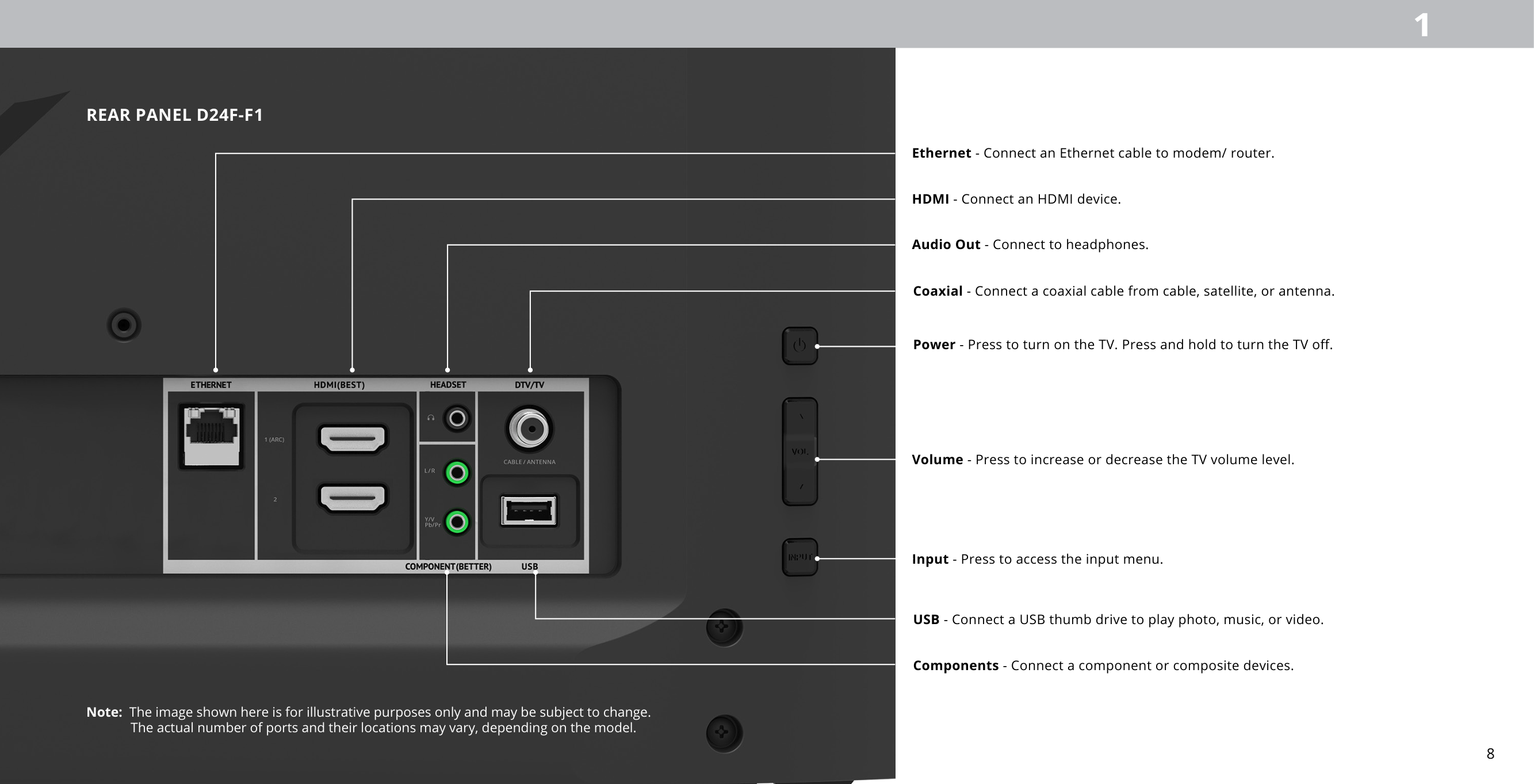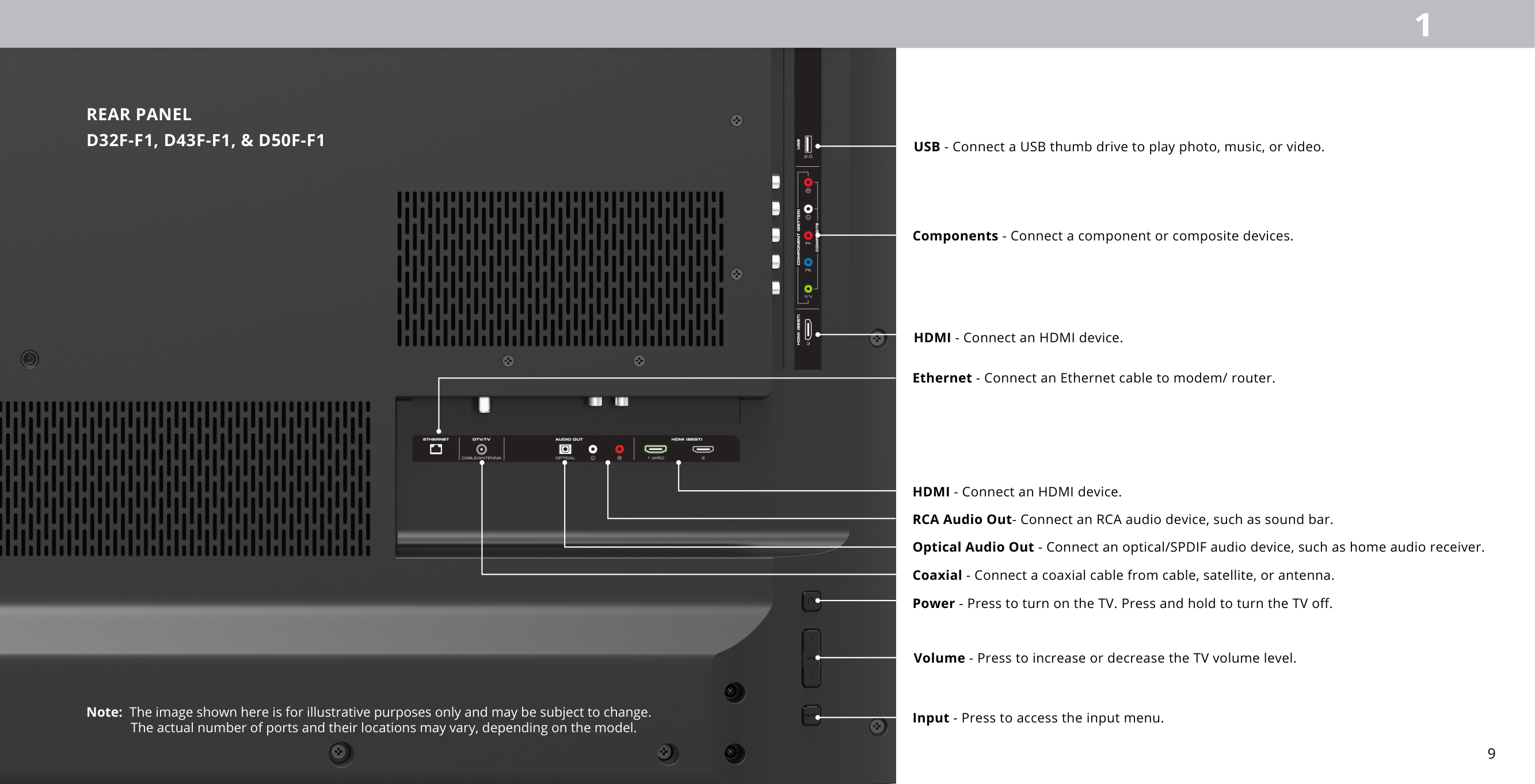 USB - Connect a USB thumb drive to play photo, music, or video.9 1 Components - Connect a component or composite devices. USB - Connect a USB thumb drive to play photo, music, or video. HDMI - Connect an HDMI device. HDMI - Connect an HDMI device. RCA Audio Out- Connect an RCA audio device, such as sound bar. Optical Audio Out - Connect an optical/SPDIF audio device, such as home audio receiver. Power - Press to turn on the TV. Press and hold to turn the TV off. Input - Press to access the input menu. Note: The image shown here is for illustrative purposes only and may be subject to change. The actual number of ports and their locations may vary, depending on the model. Volume - Press to increase or decrease the TV volume level. Ethernet - Connect an Ethernet cable to modem/ router. Coaxial - Connect a coaxial cable from cable, satellite, or antenna.